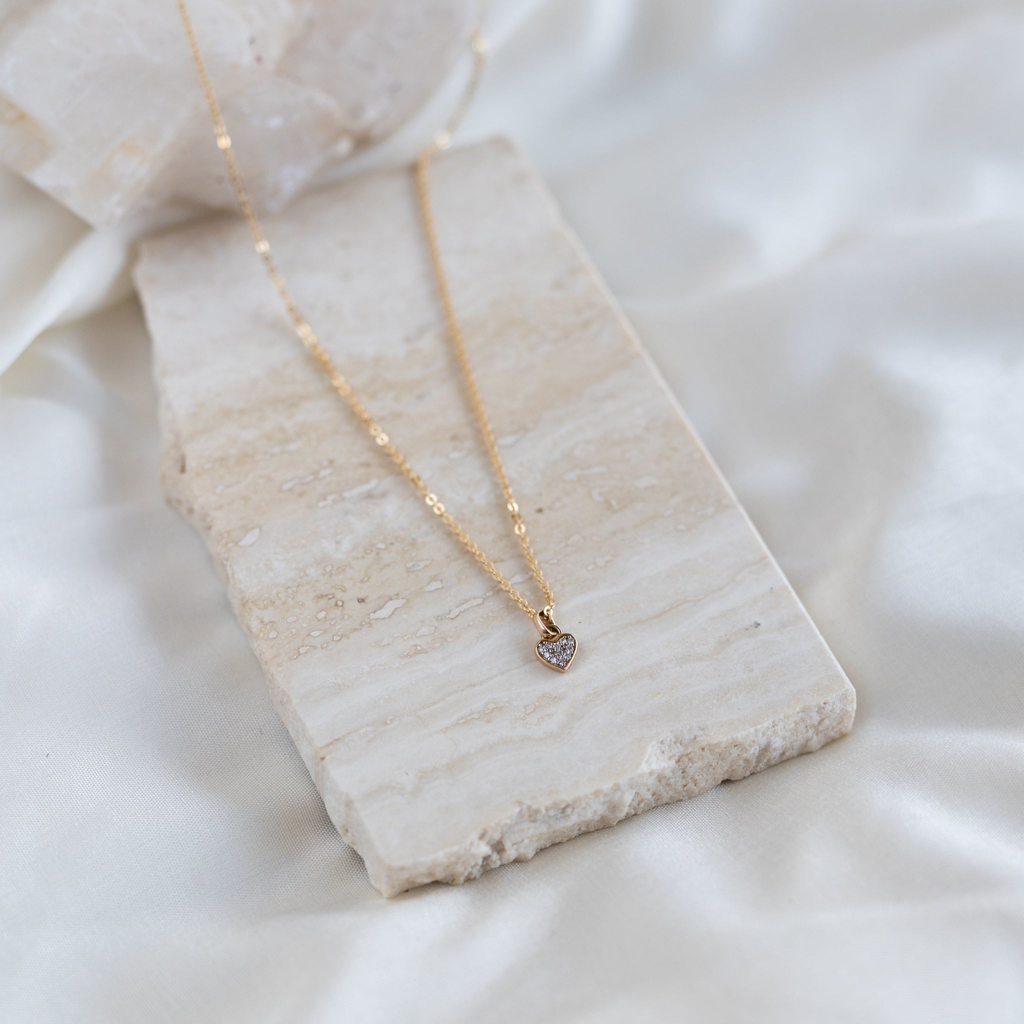 A petite 14k heart necklace with embedded diamonds.The heart charm is set with 11 x 0.005-ct round white diamonds.Hangs on 14k gold fill chain.