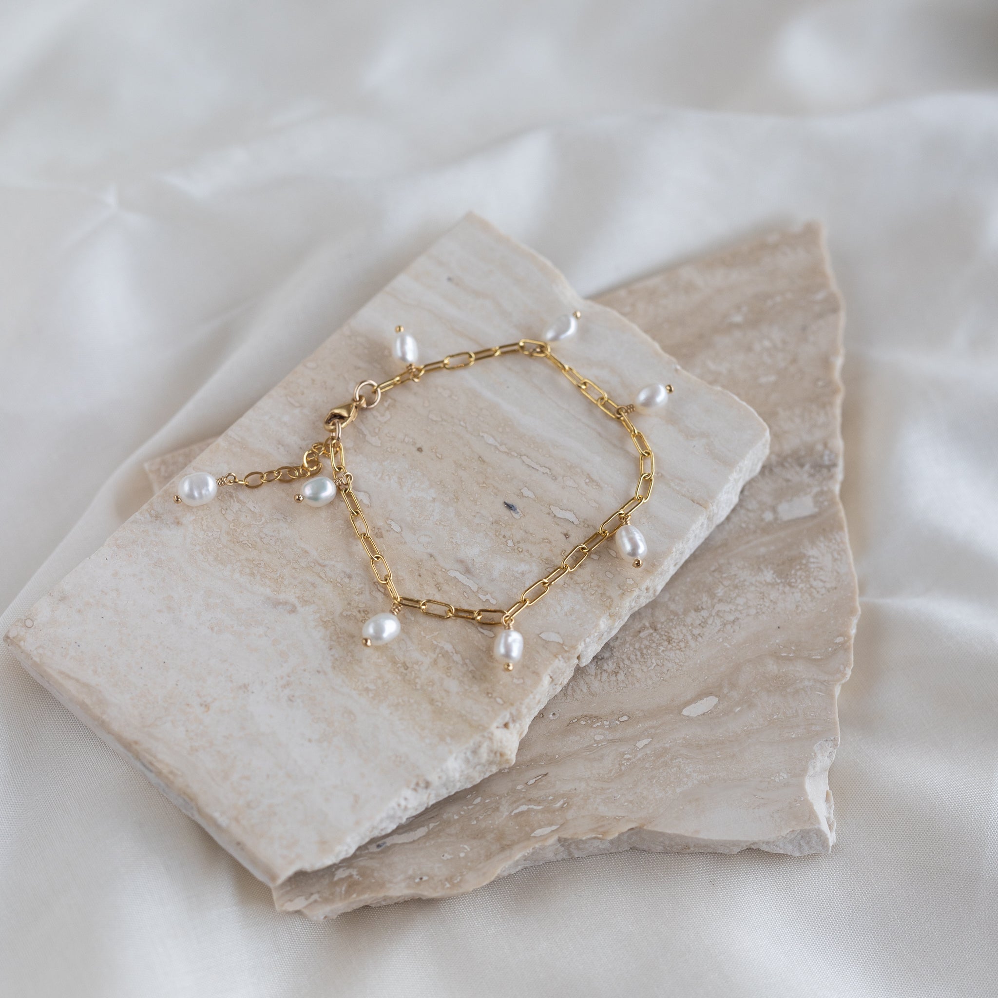 A chunkier version of our popular Teardrop Pearl Bracelet. The fresh water pearls swing freely, giving this bracelet lovely movement as it drops down on your wrist.