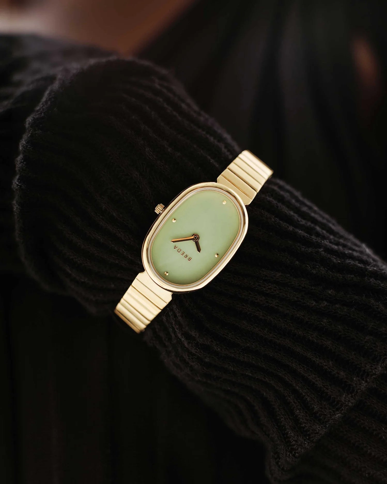 Inspired by days spent in the sun by the water and followed by evenings of indulgence. The Jane carries a delicate 23mm oval case, green colored mother of pearl dial and gold-plated stainless steel bracelet that fastens with a jewelry clasp. An effortlessly elegant and classic style.