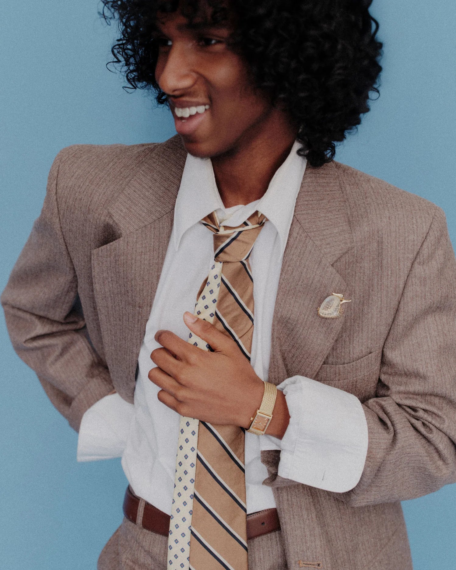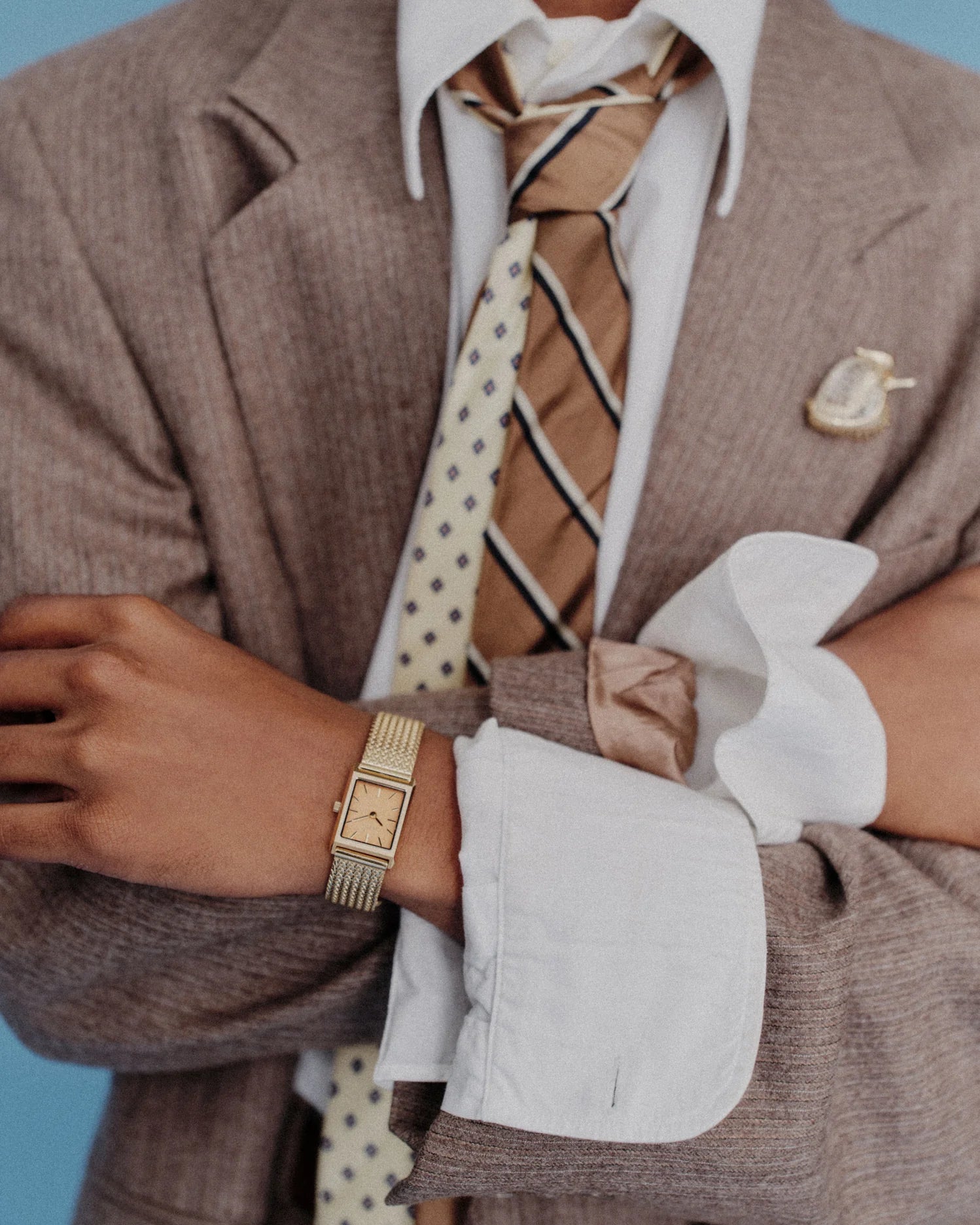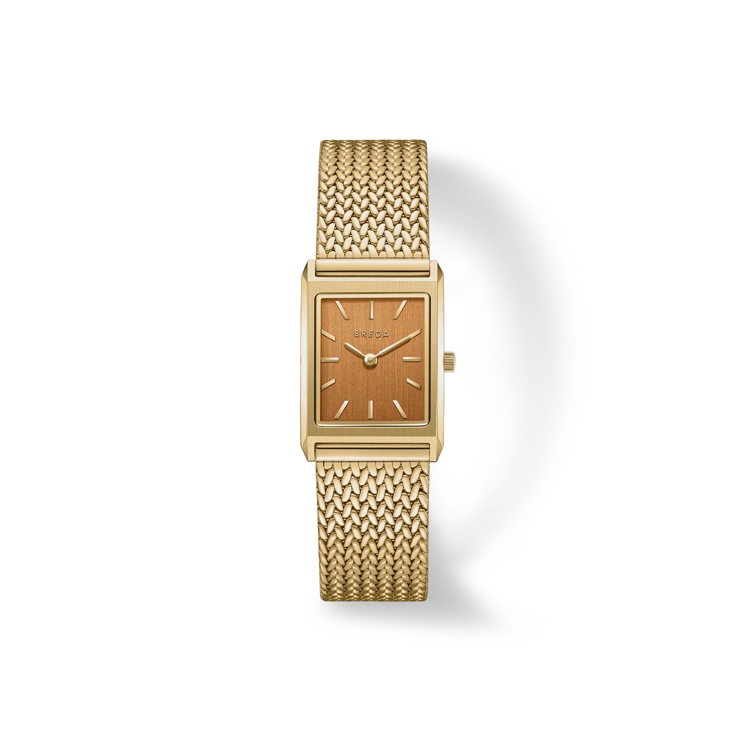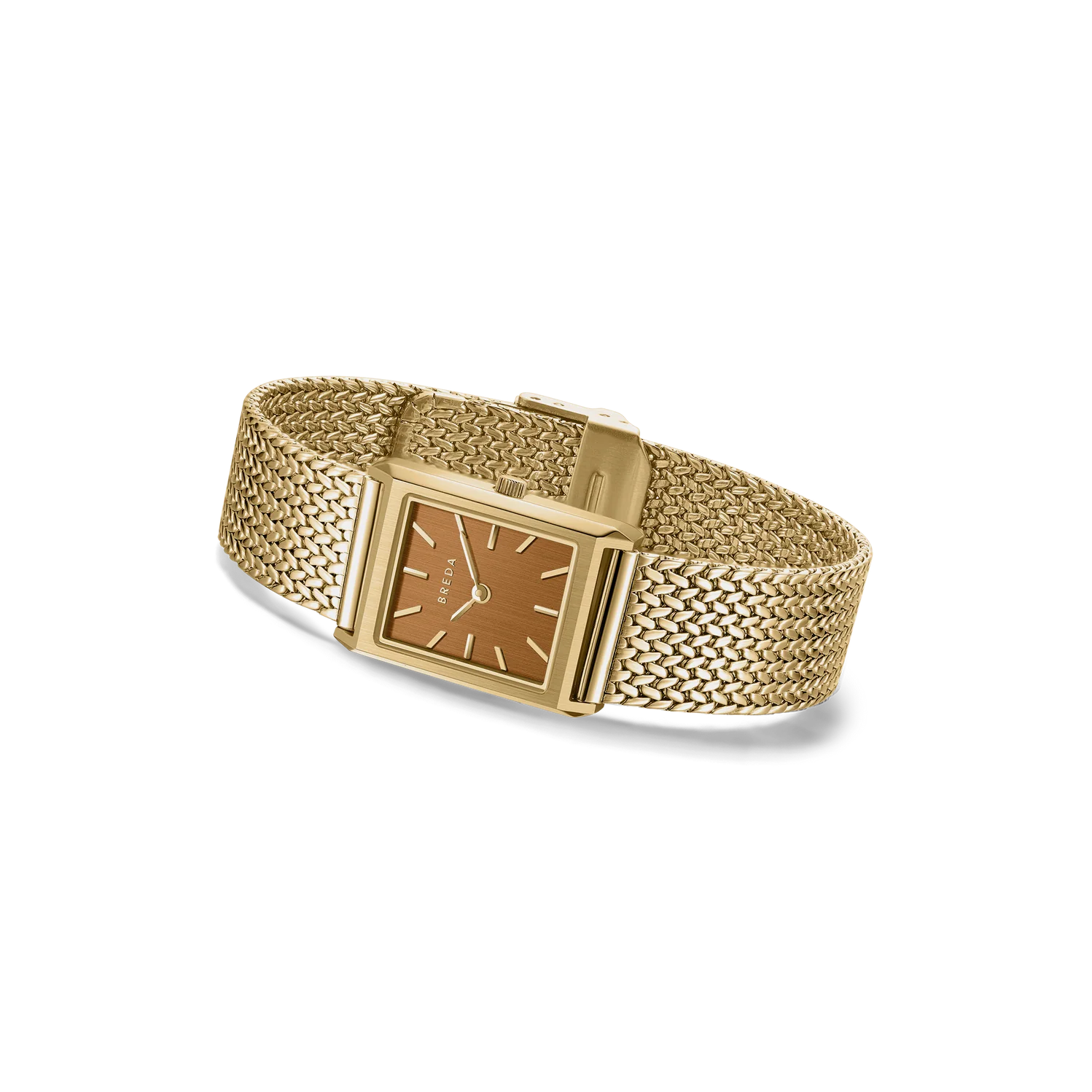 The Tethered Collection exists as a daily reminder of our human connection and our shared memories intertwined, endlessly collapsing together. The Virgil (Tethered) Small features a more compact 20mm rectangle case and is complemented by an ochre brushed dial with a woven mesh bracelet that fastens with a quick release clasp.