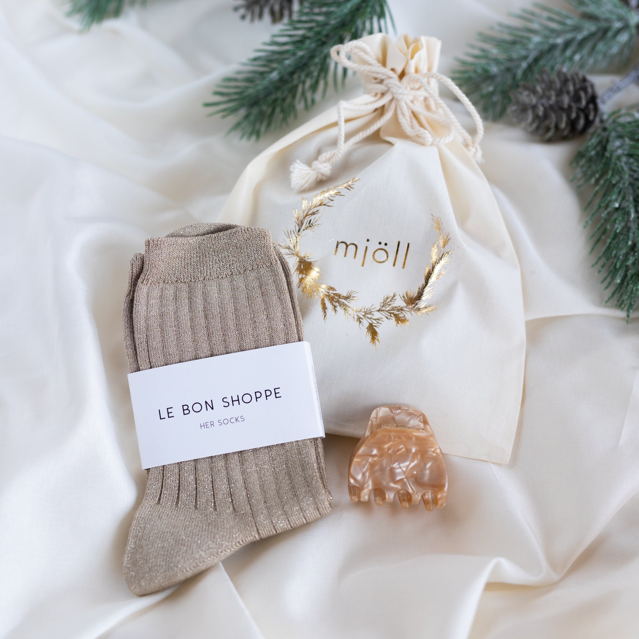 Our little gift bag this Christmas is a pair of our favourite glitter socks from Le Bon Shoppe & a colour coordinated hair claw.