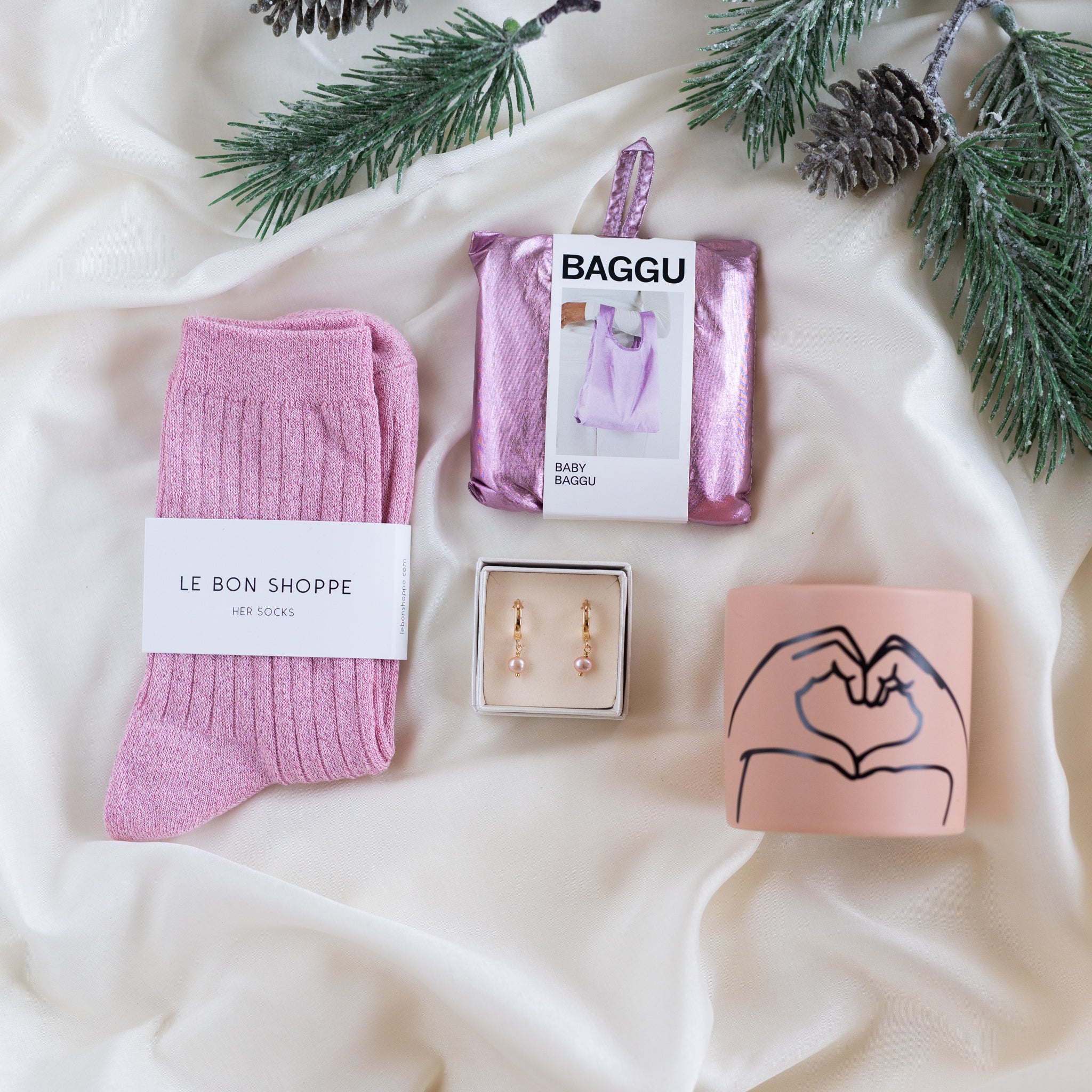 Our popular Lily Pearl Huggies, a pair of Le Bon Shoppe glitter Socks, a scented soy candle with an endearing impression from Paddywax & a metallic reusable bag from BAGGU.