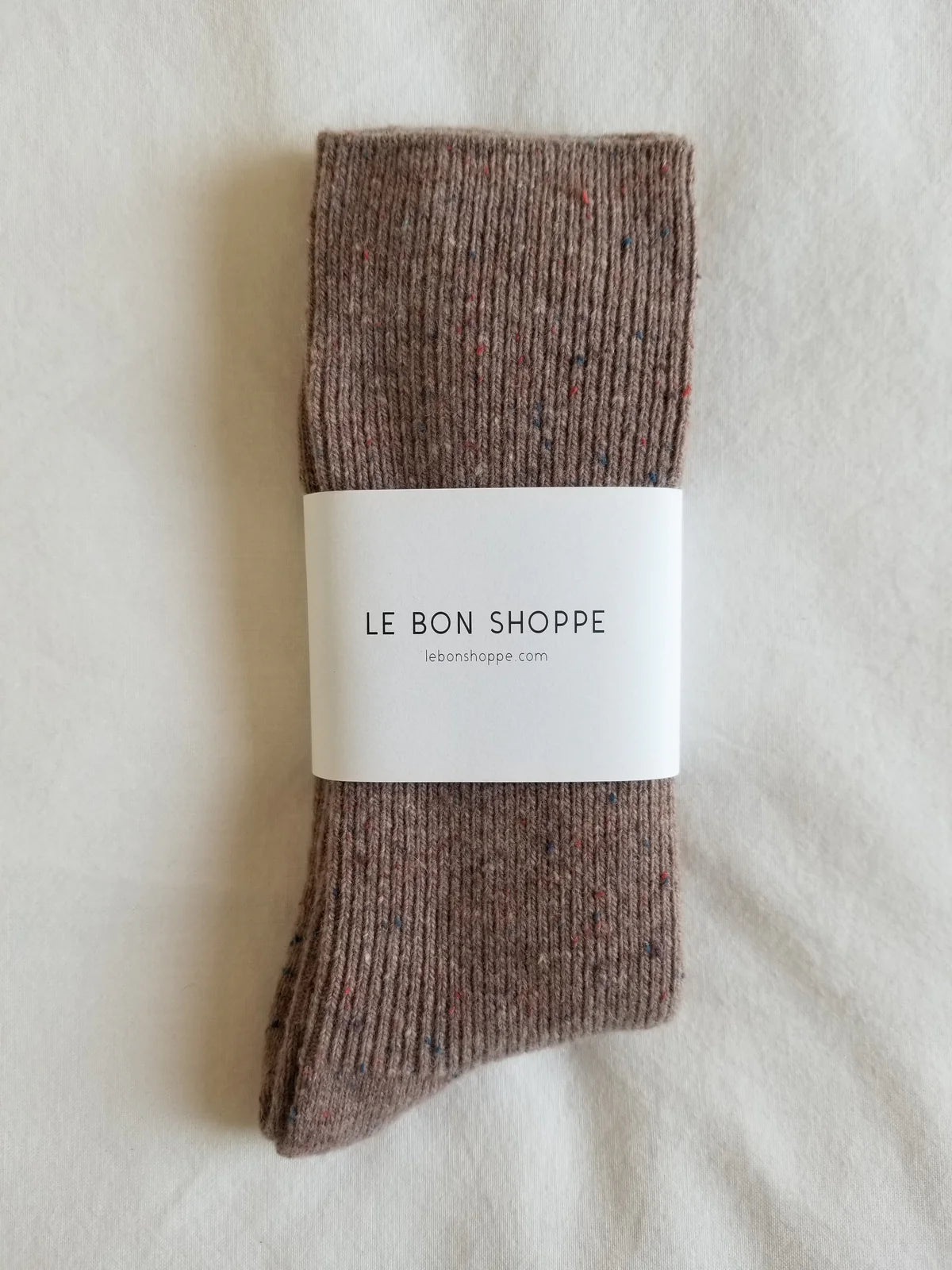 Made of a simple wool-blend, these socks are the perfect essential for cold weather. Snow Socks have a charming speckled look with calf length coverage. Double them for extra warmth while they carry your feet through the season with elegance. Pair them with anything from shearling booties to fisherman sandals in the fall.