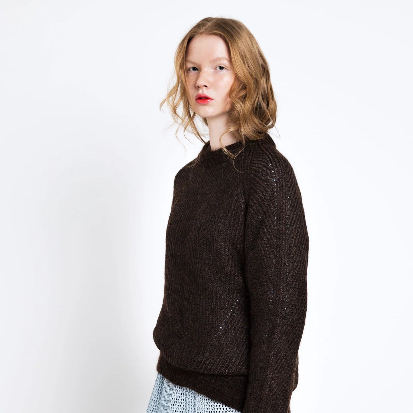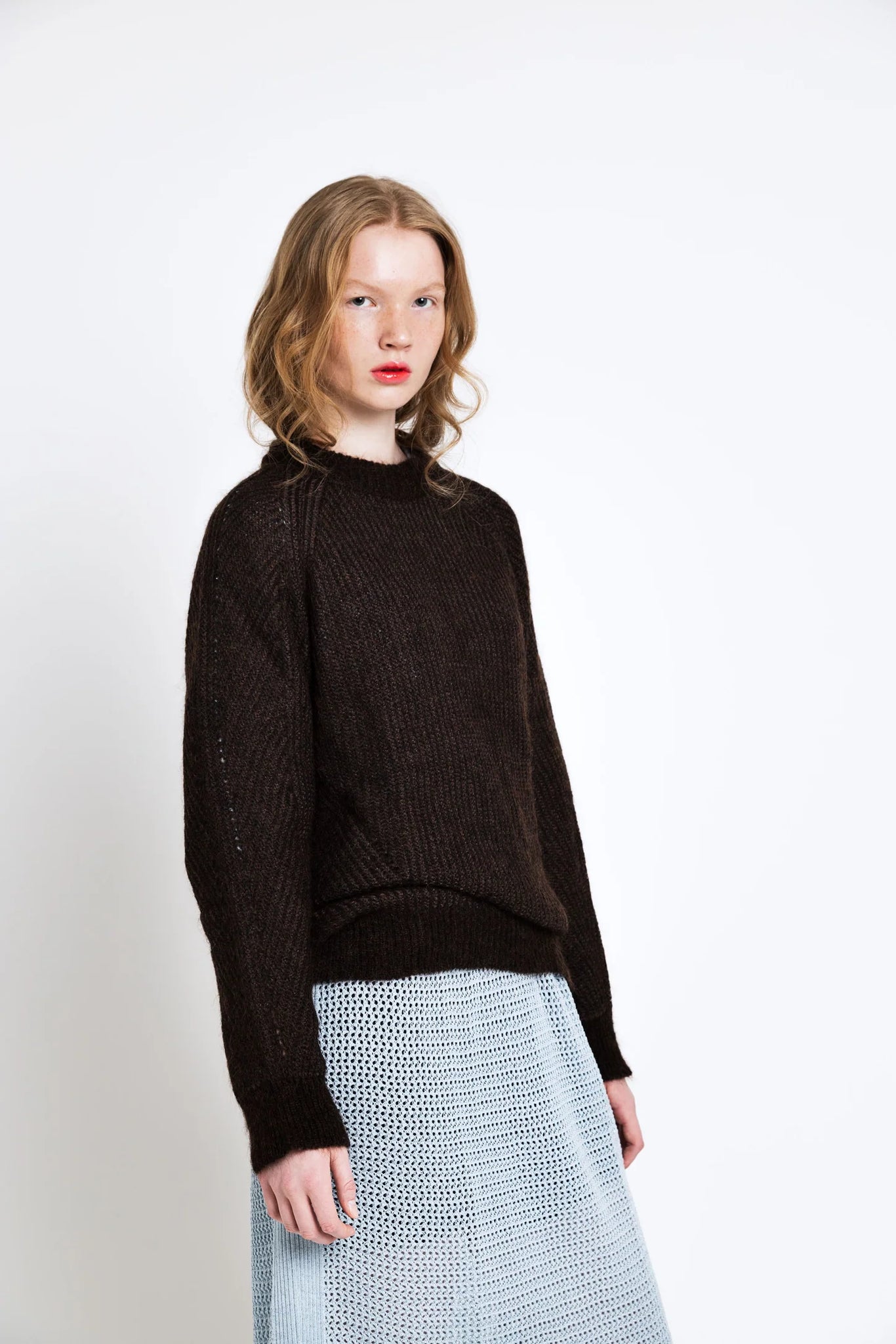 A delicate blend of mohair and merino wool creates the two coloured Ash jumper, an elegant yet relaxed style, loose fit with mohair neck, hem and cuffs