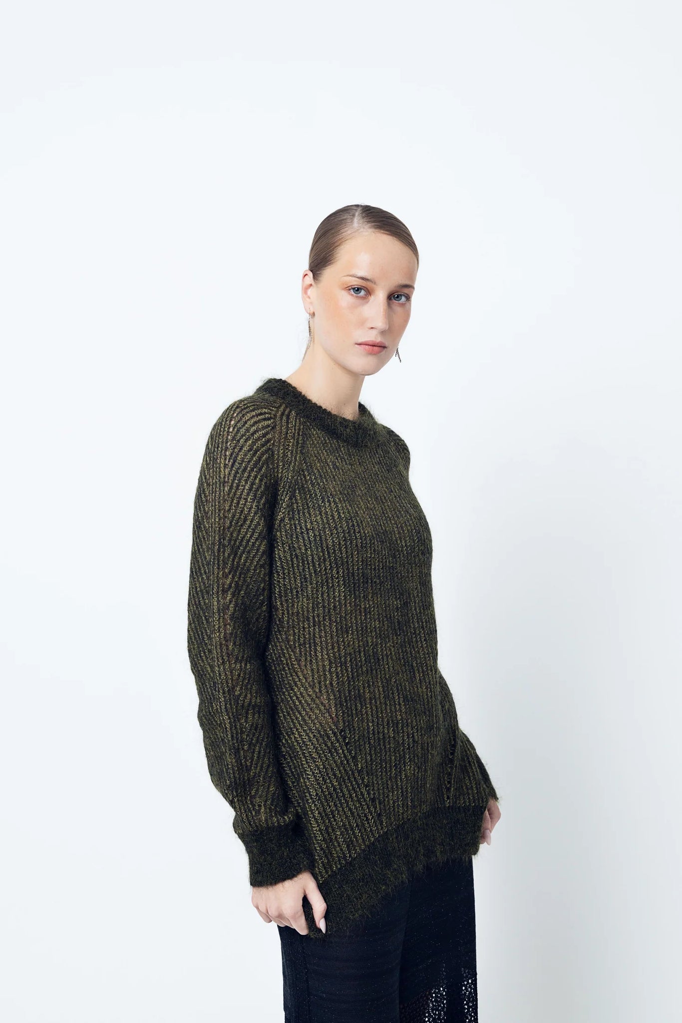 A delicate blend of mohair and merino wool creates the two coloured Ash jumper, an elegant yet relaxed style, loose fit with mohair neck, hem and cuffs