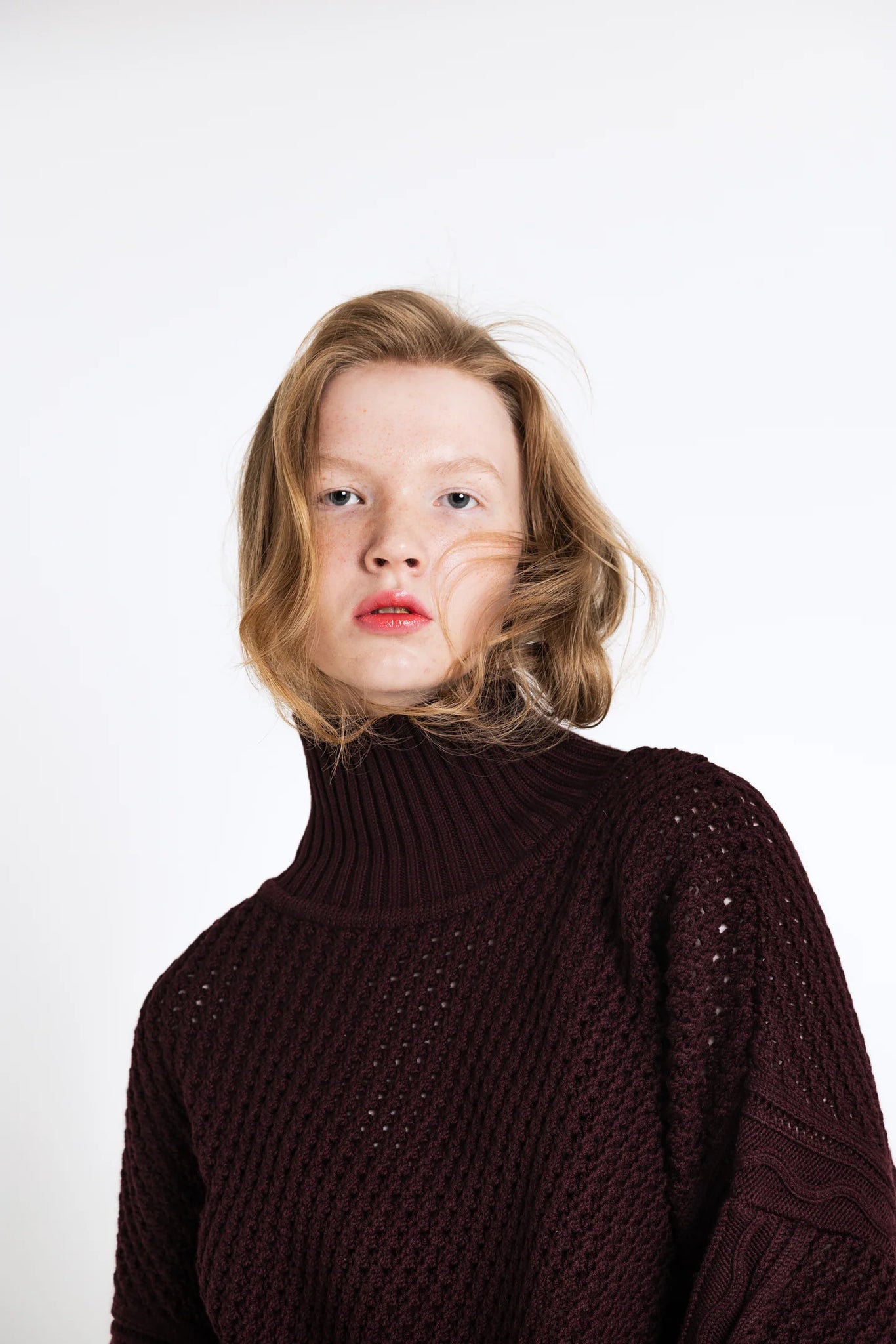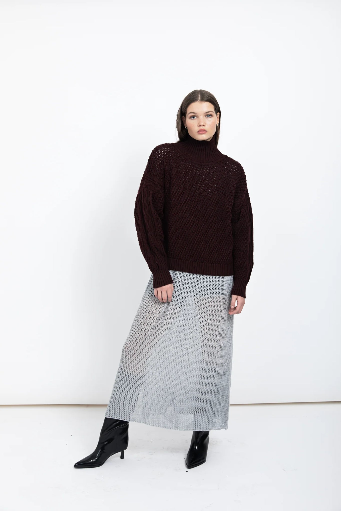 Softly knit in chunky lace and cables, Nina sweater is an elegant piece with careful attention to detail. Turtleneck, dropped shoulders with cable knit detail on sleeves + sides.