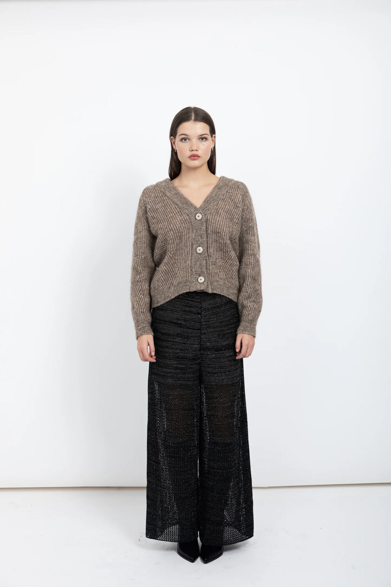 A delicate blend of mohair and merino creates Sasha cardi, an elegant yet relaxed style, loose fit with mohair neck, hem and cuffs