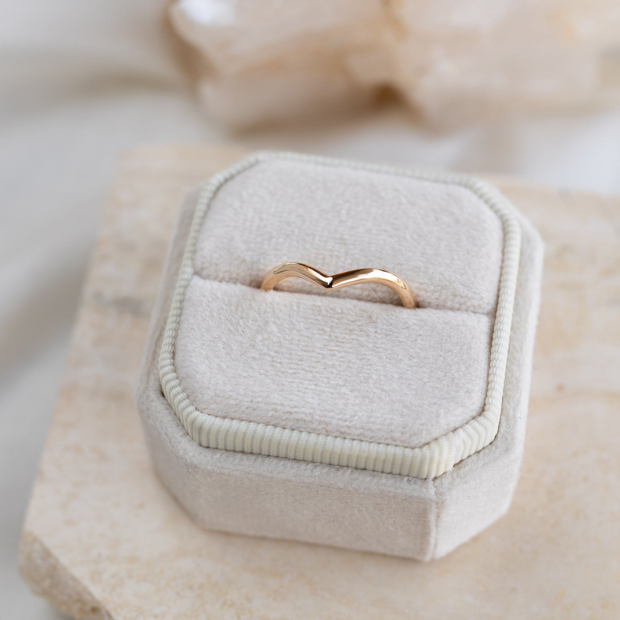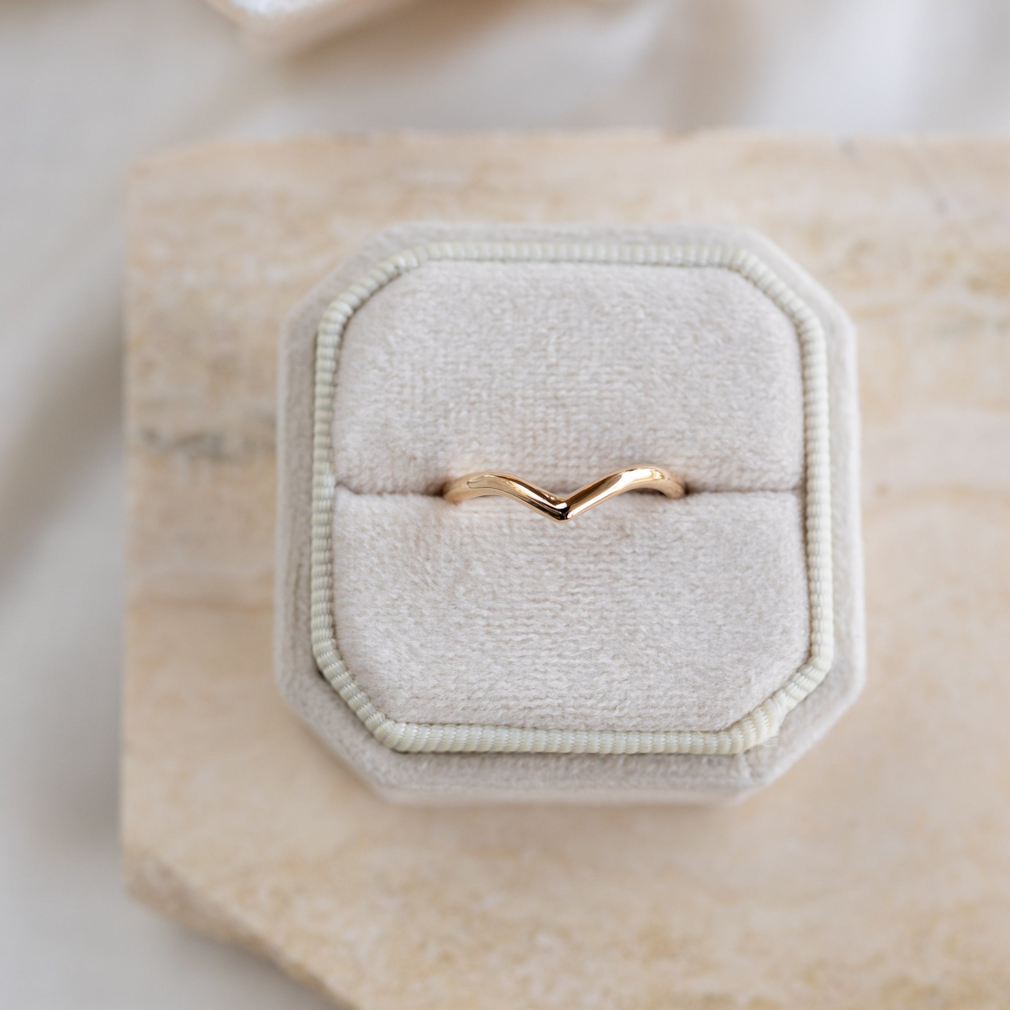 Our Classic V band stacks elegantly with an engagement ring.