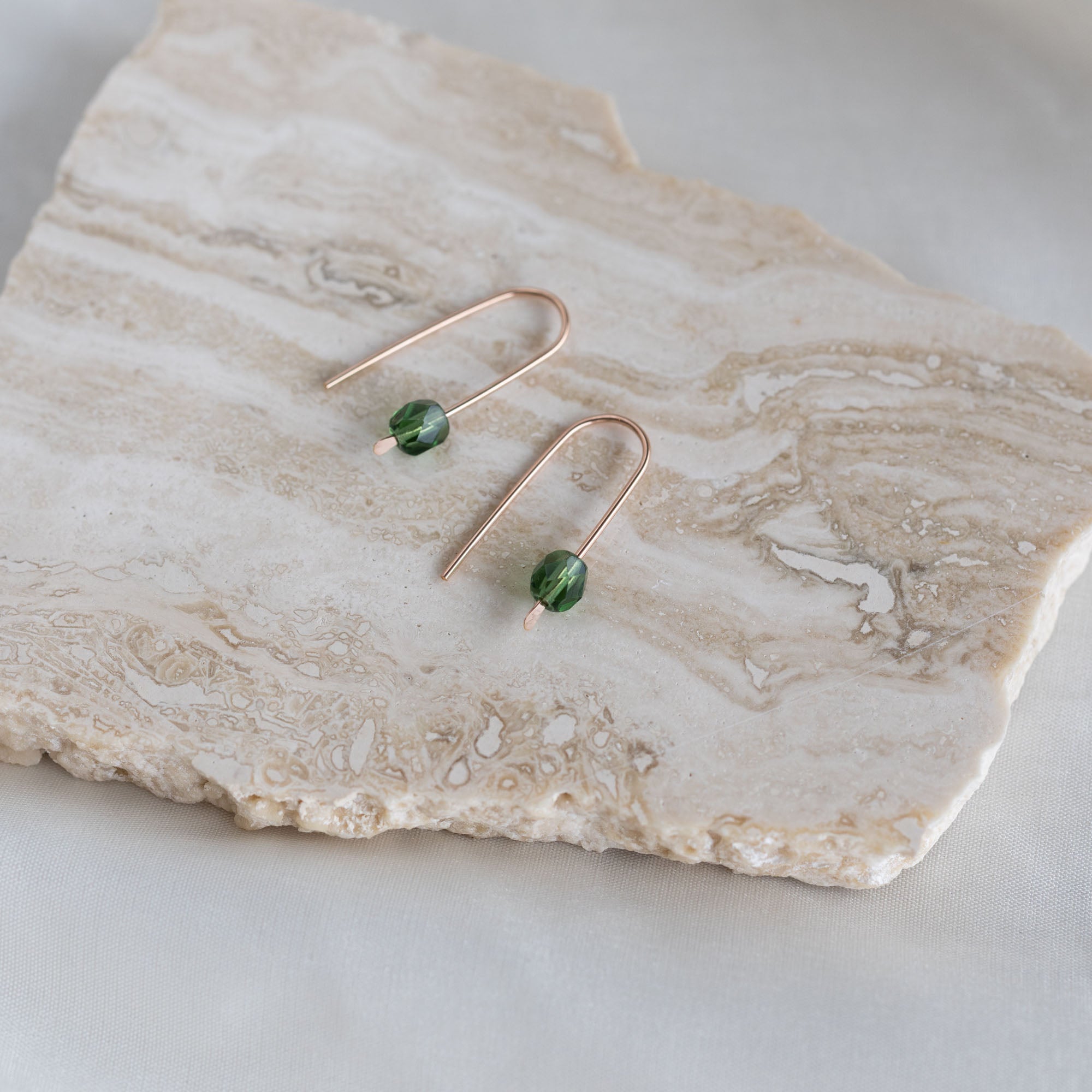 Our Arch Earrings in 14k rose gold fill with faceted, emerald green glass beads.