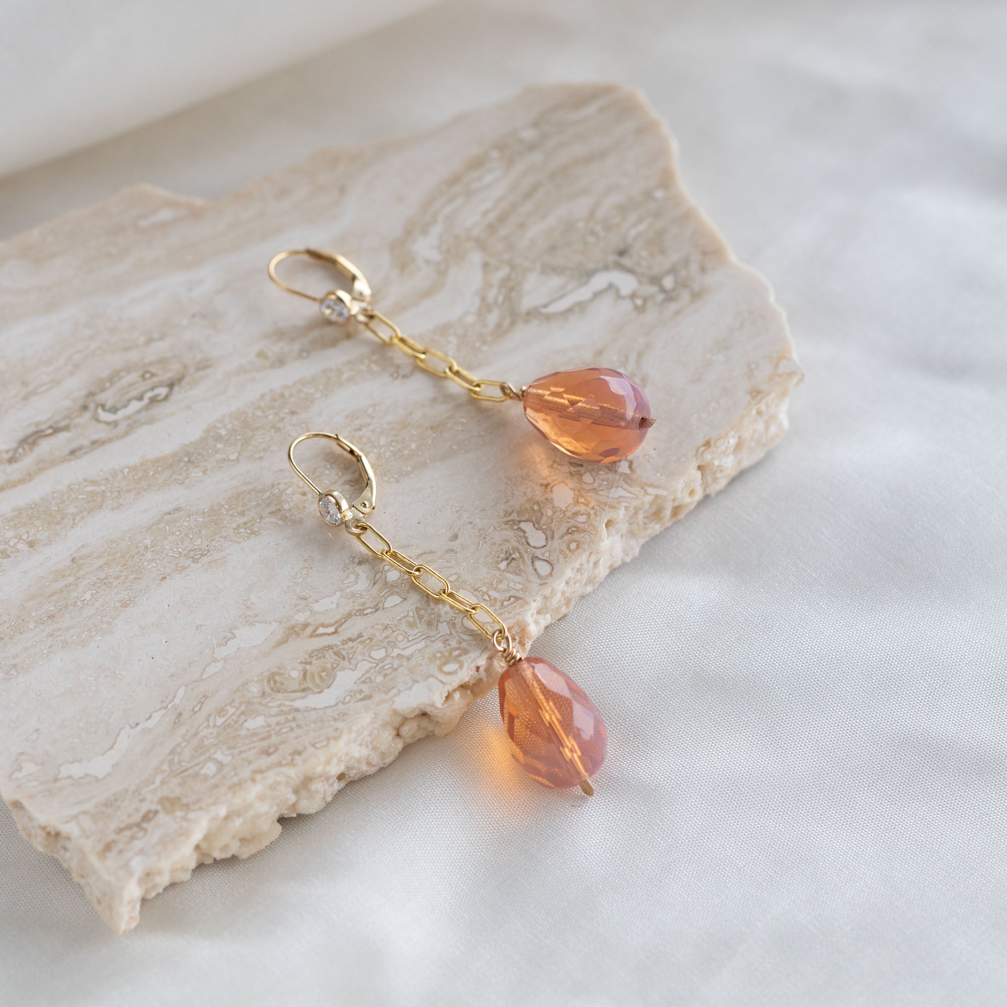 Gorgeous cocktail earrings. Drop-style earrings with faceted, milky, pastel pink glass teardrops. Ear wires include sparkly zirconias.
