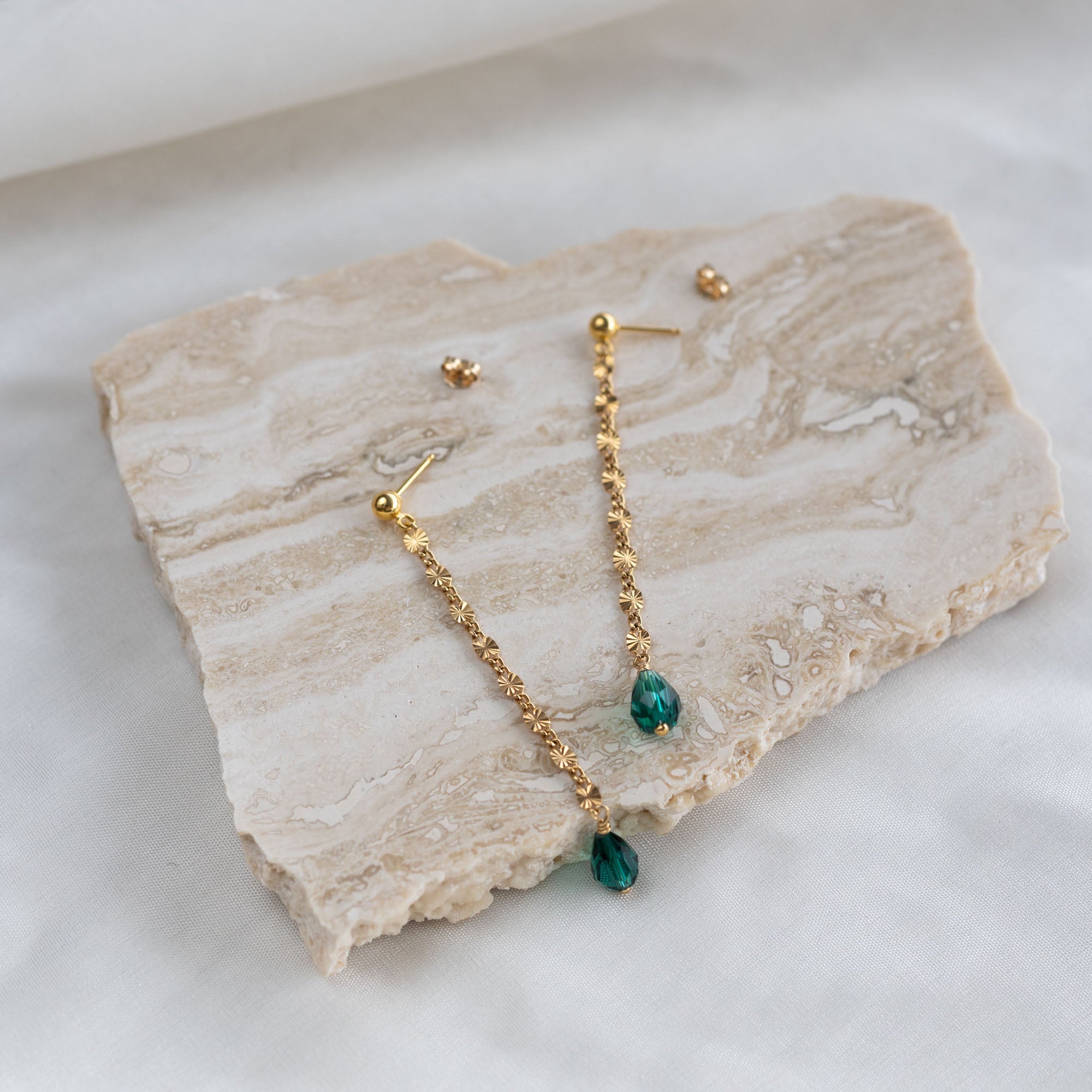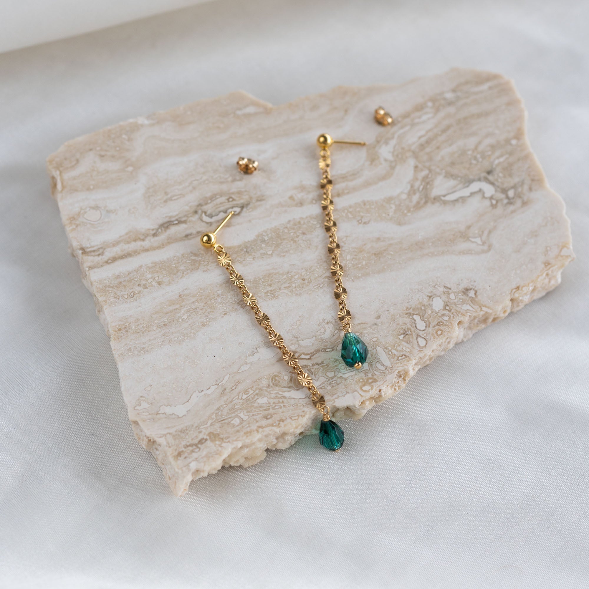 Lovely drop earrings with our sunburst chain & emerald green glass teardrops.14k gold fill