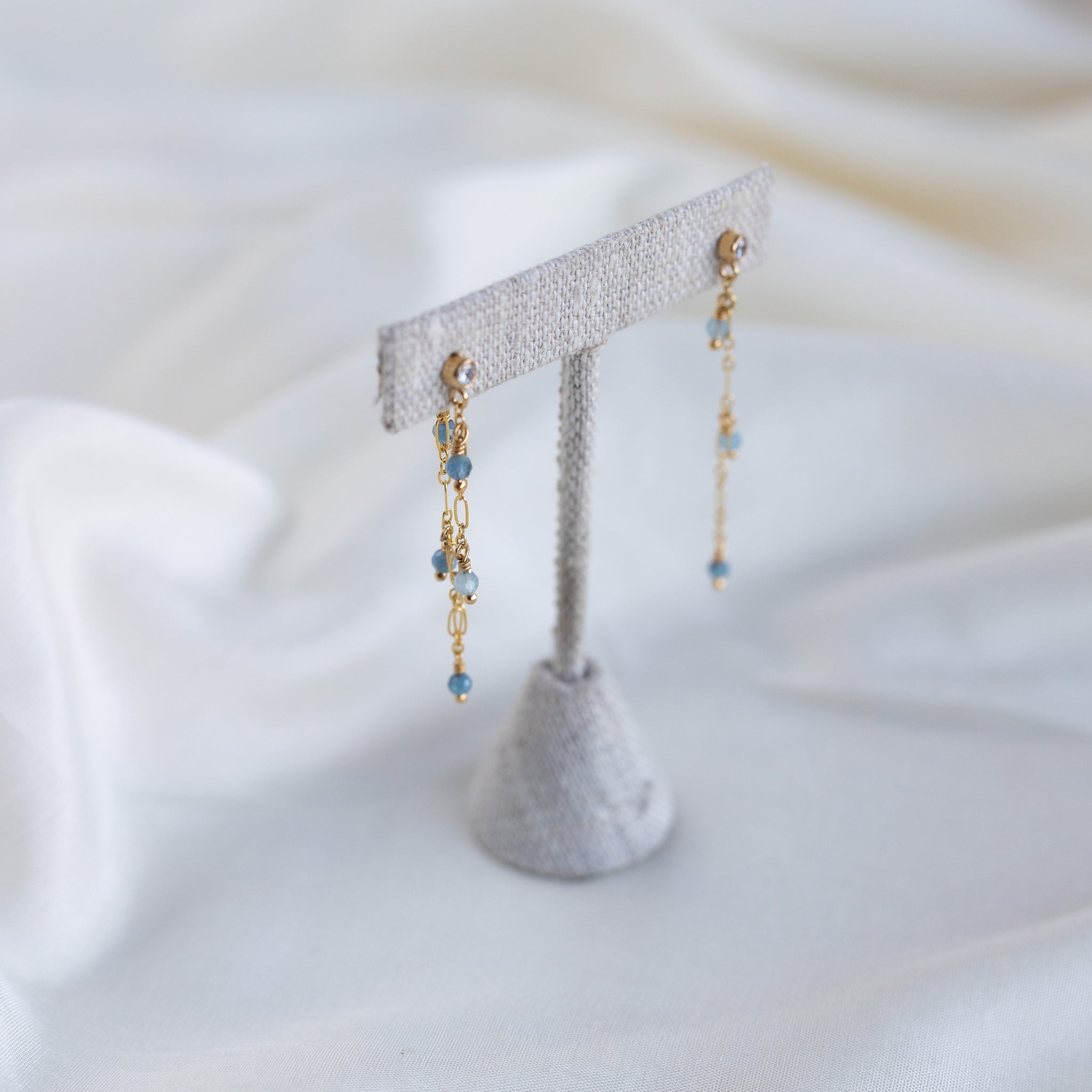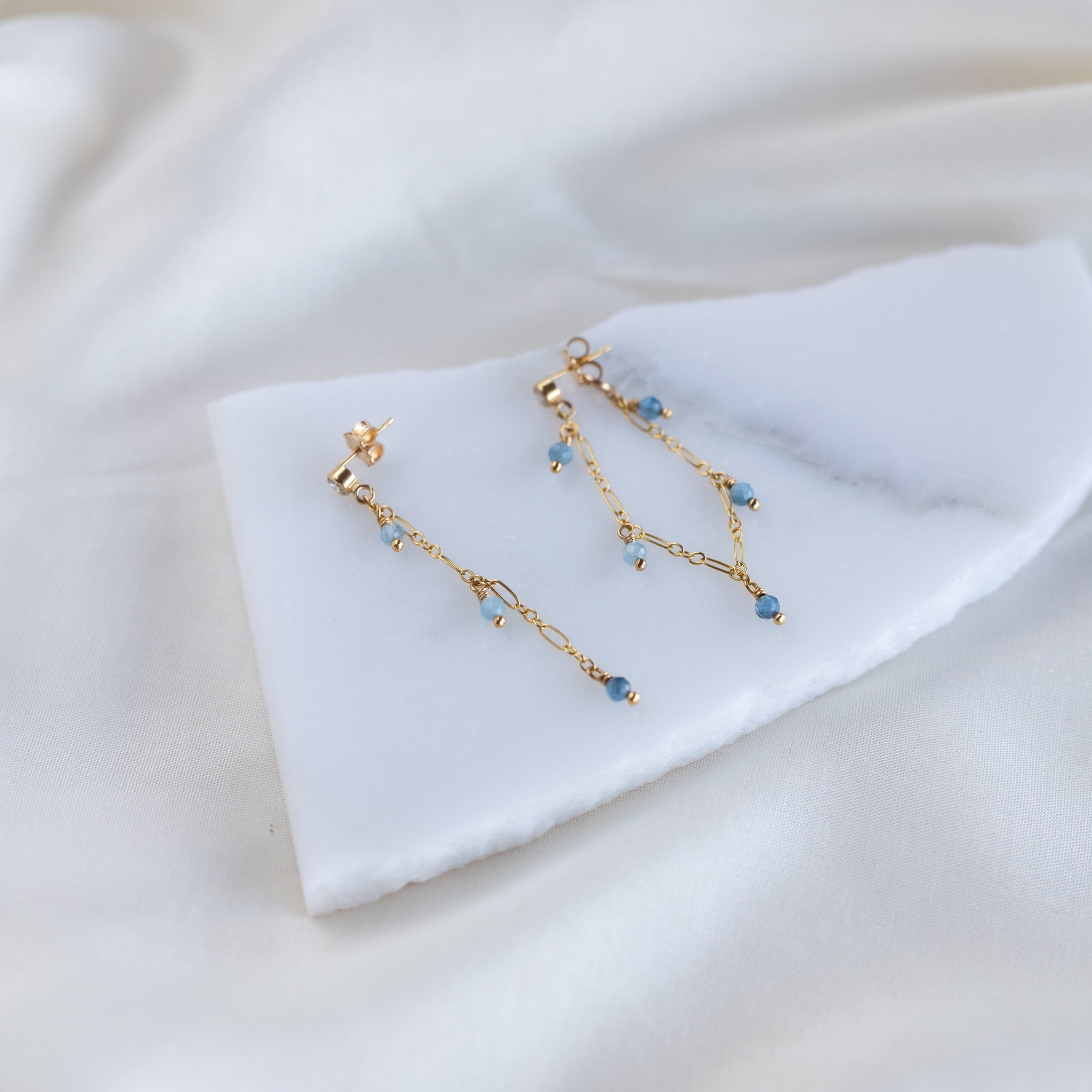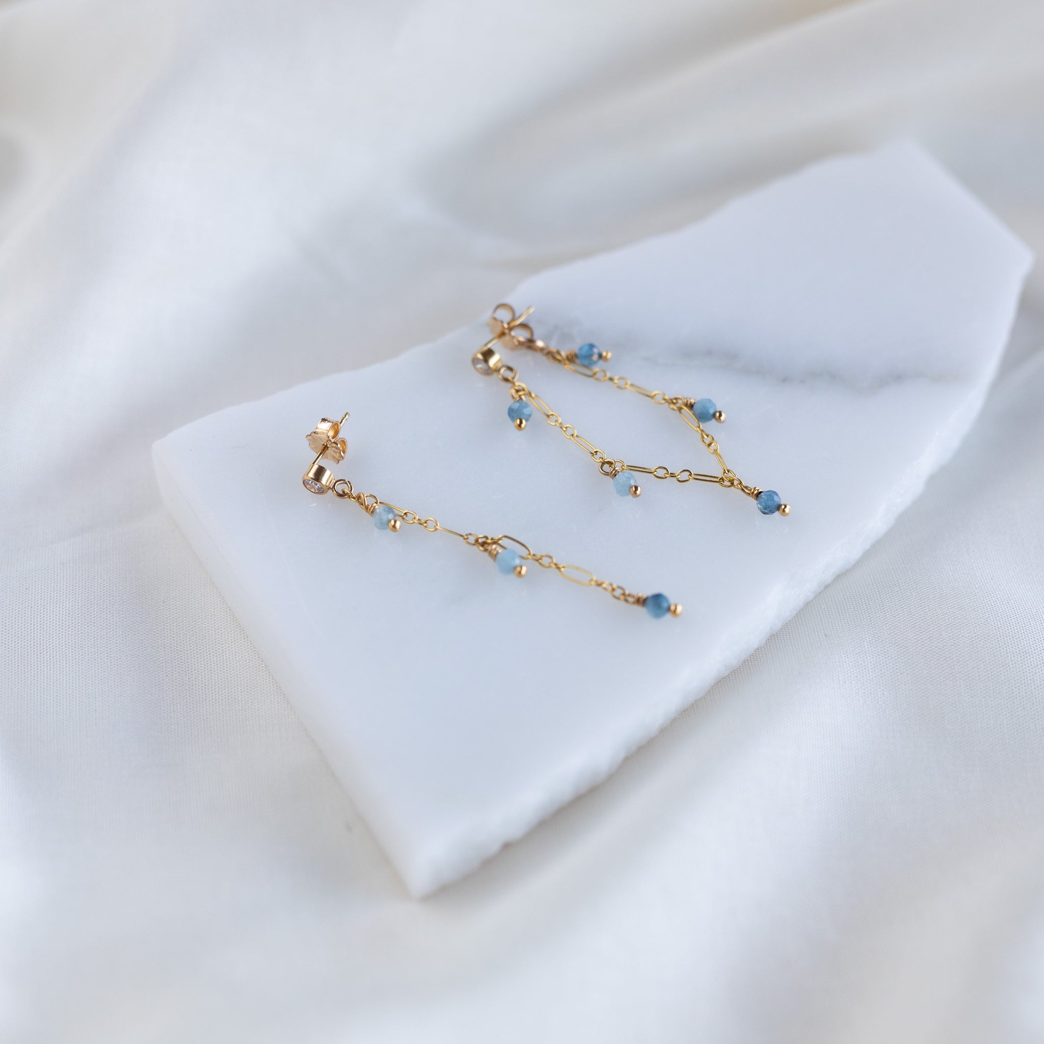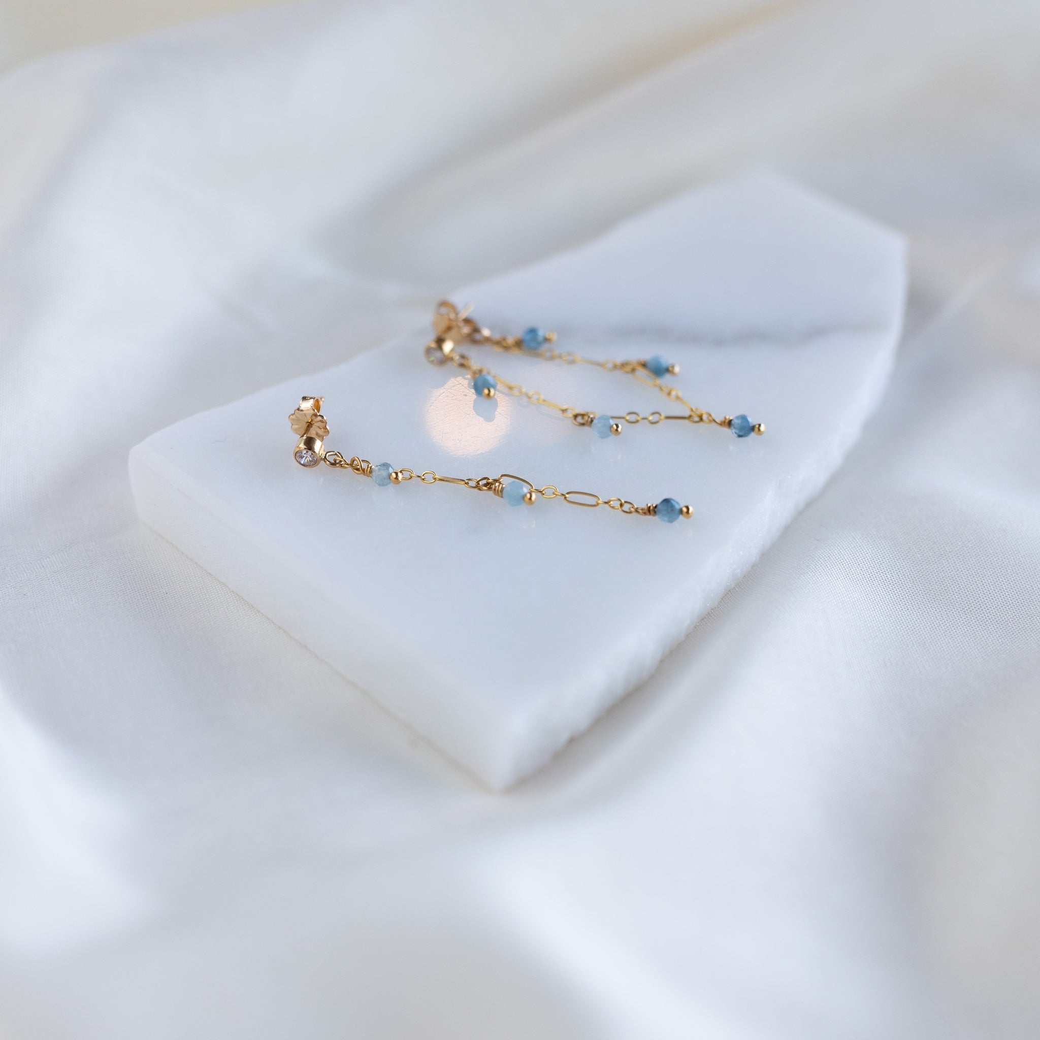 Asymmetrical tassel earrings. Aquamarine stones dangle elegantly on a 14k gold fill chain. The stones have a natural colour variation, creating depth & movement.