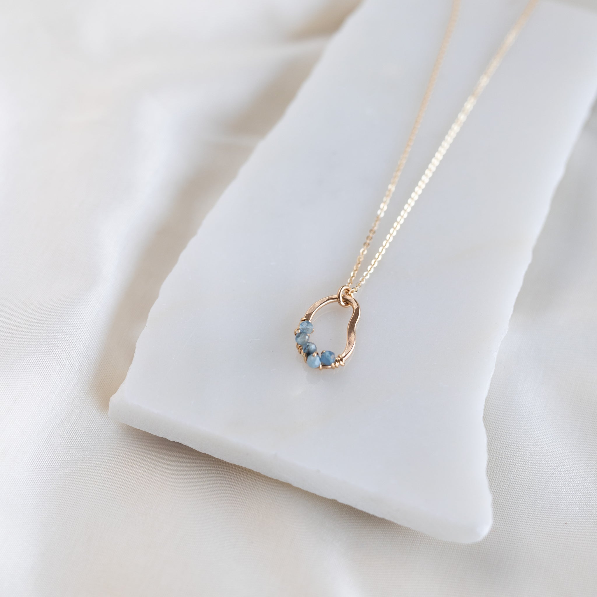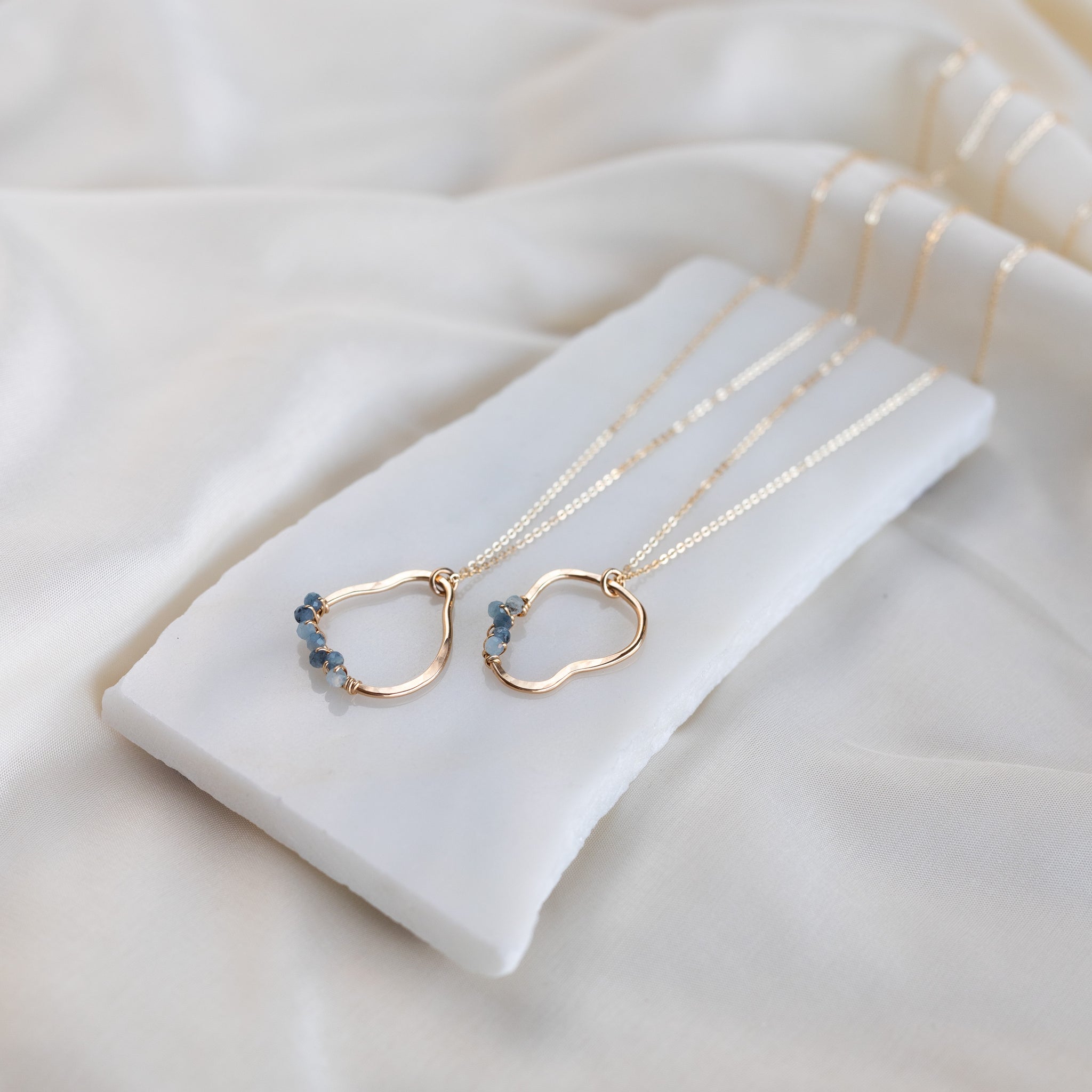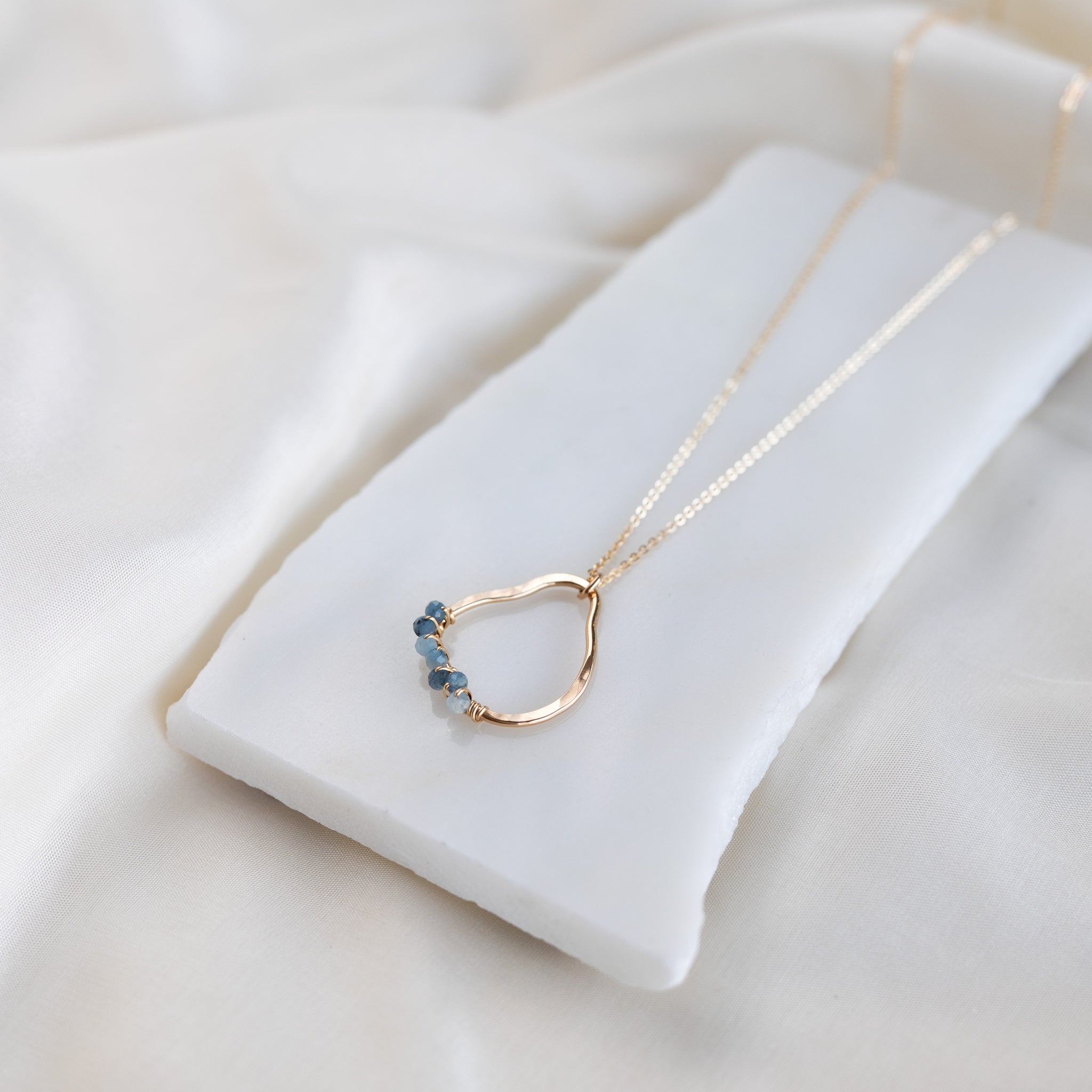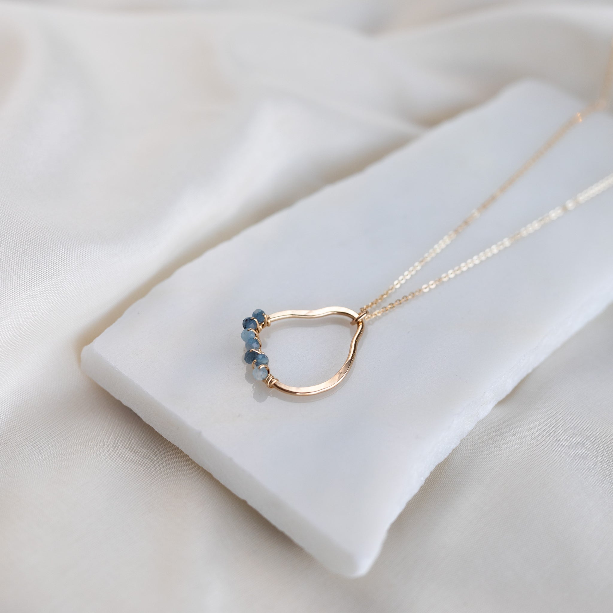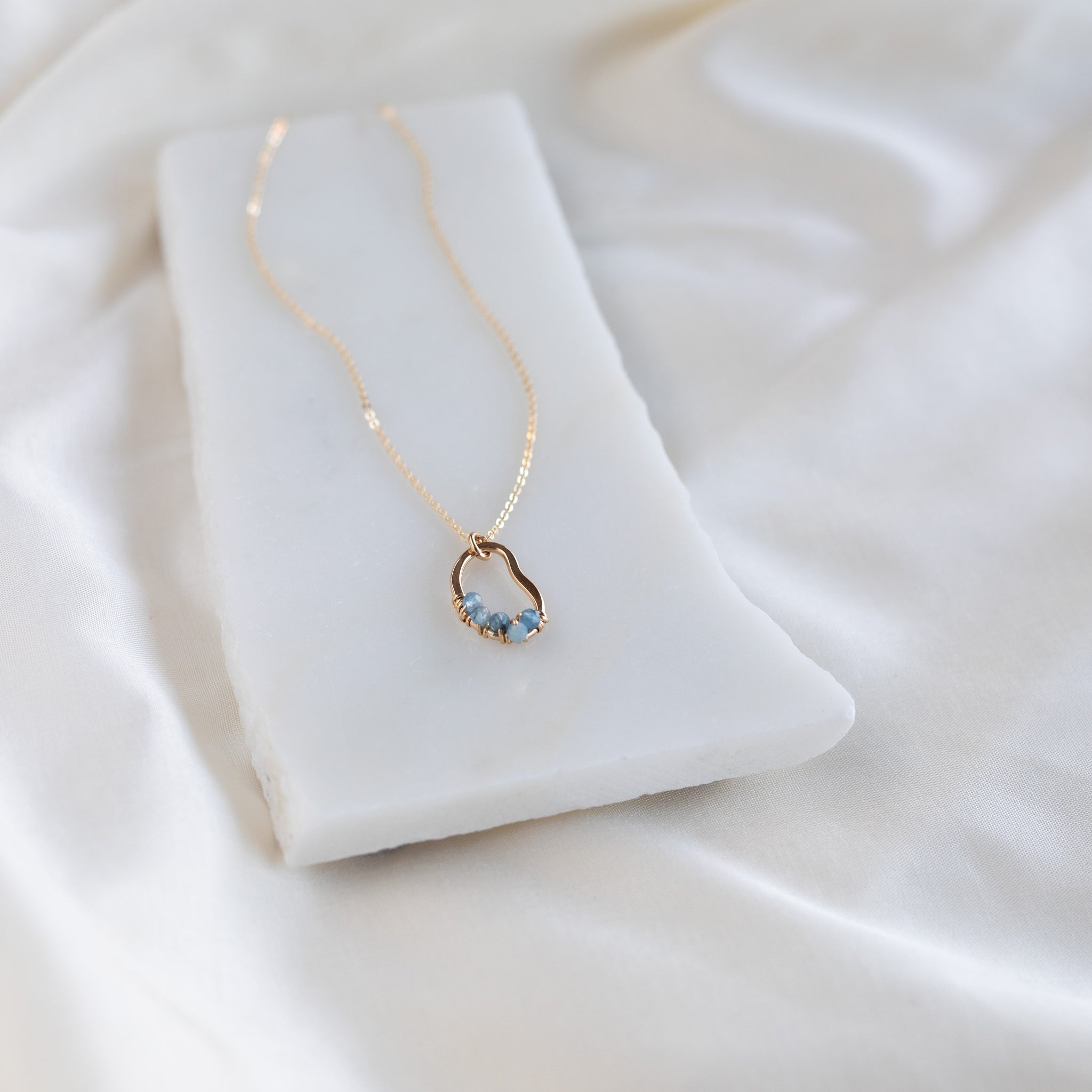 Our vök necklace with aquamarine combines soft, fluid form along with faceted, natural blue aquamarine stones.