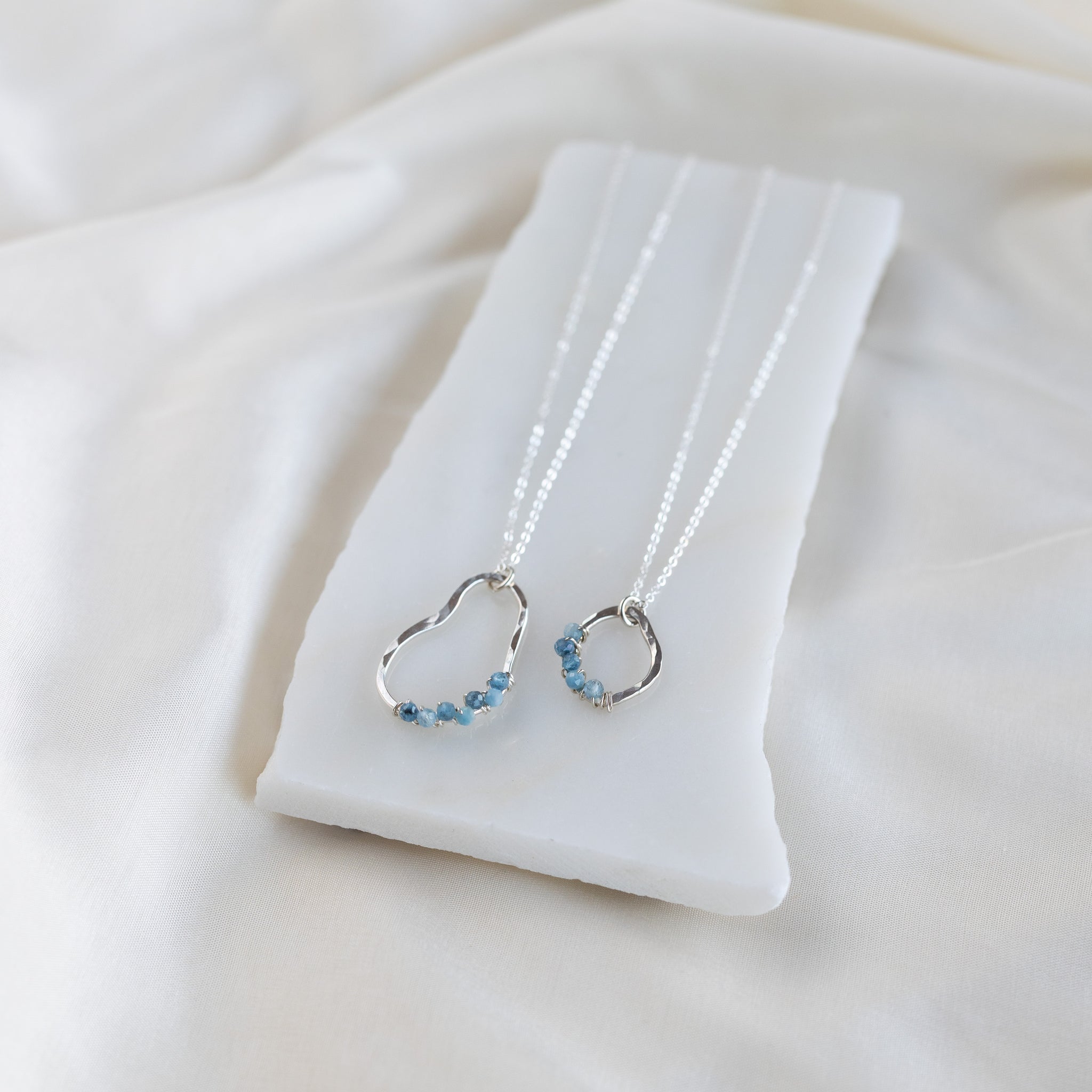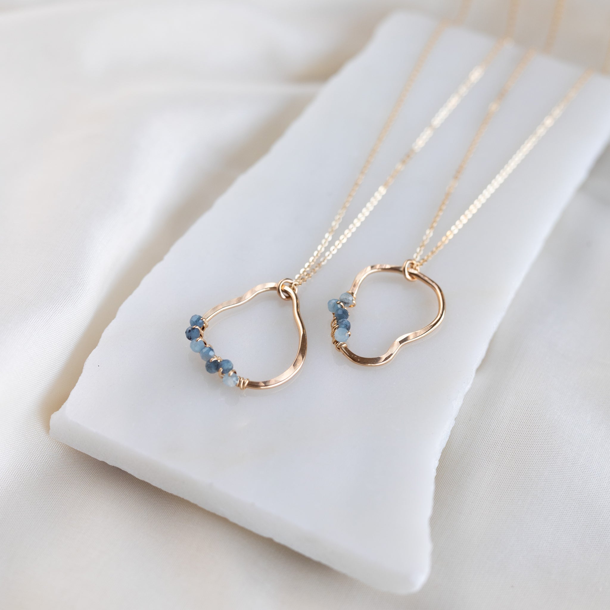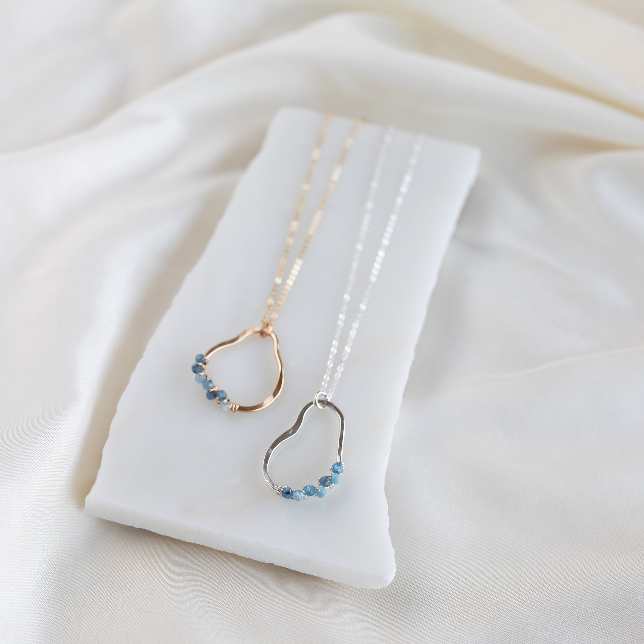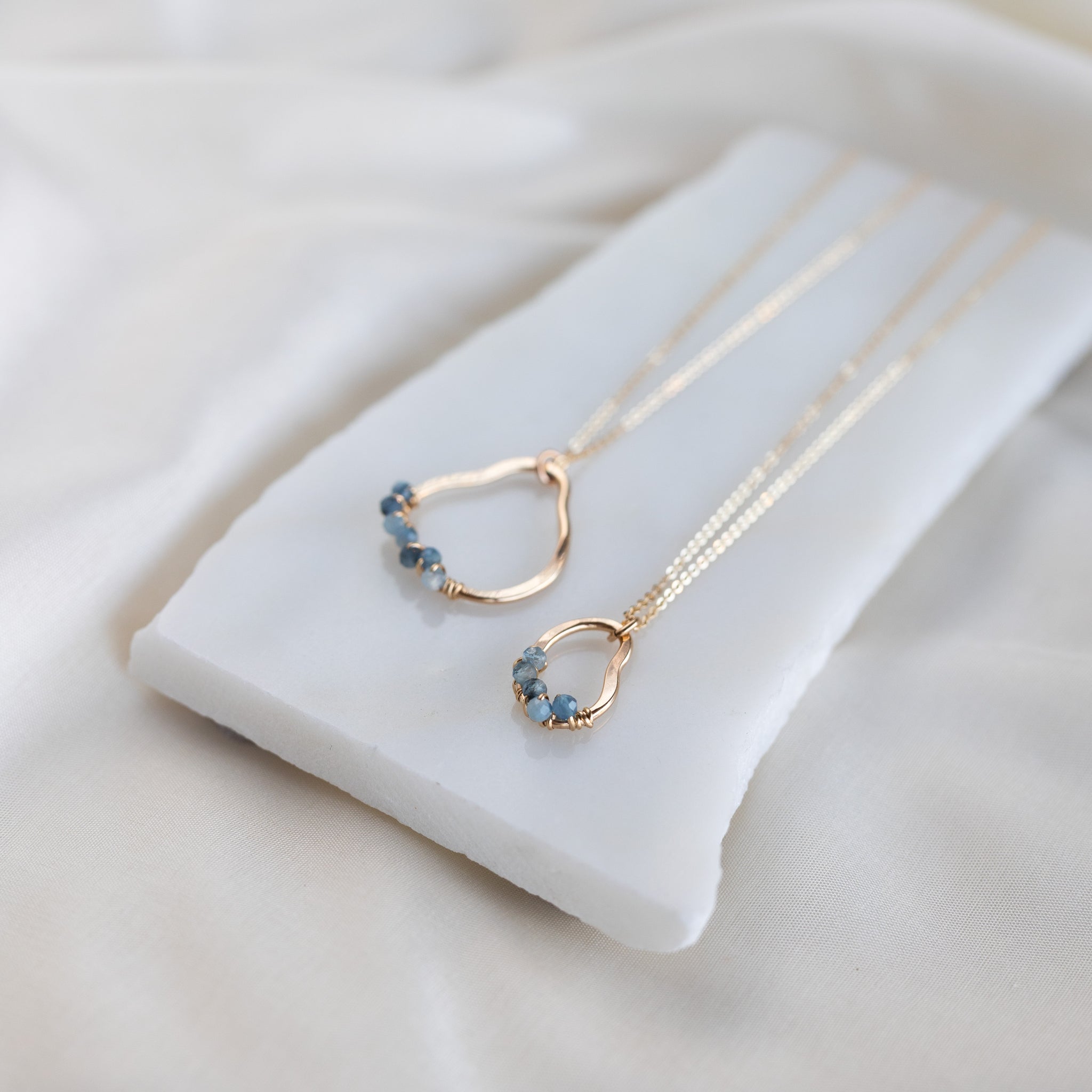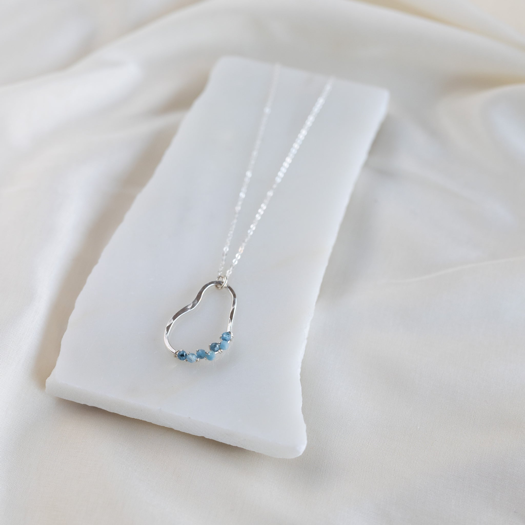 Our vök necklace with aquamarine combines soft, fluid form along with faceted, natural blue aquamarine stones.