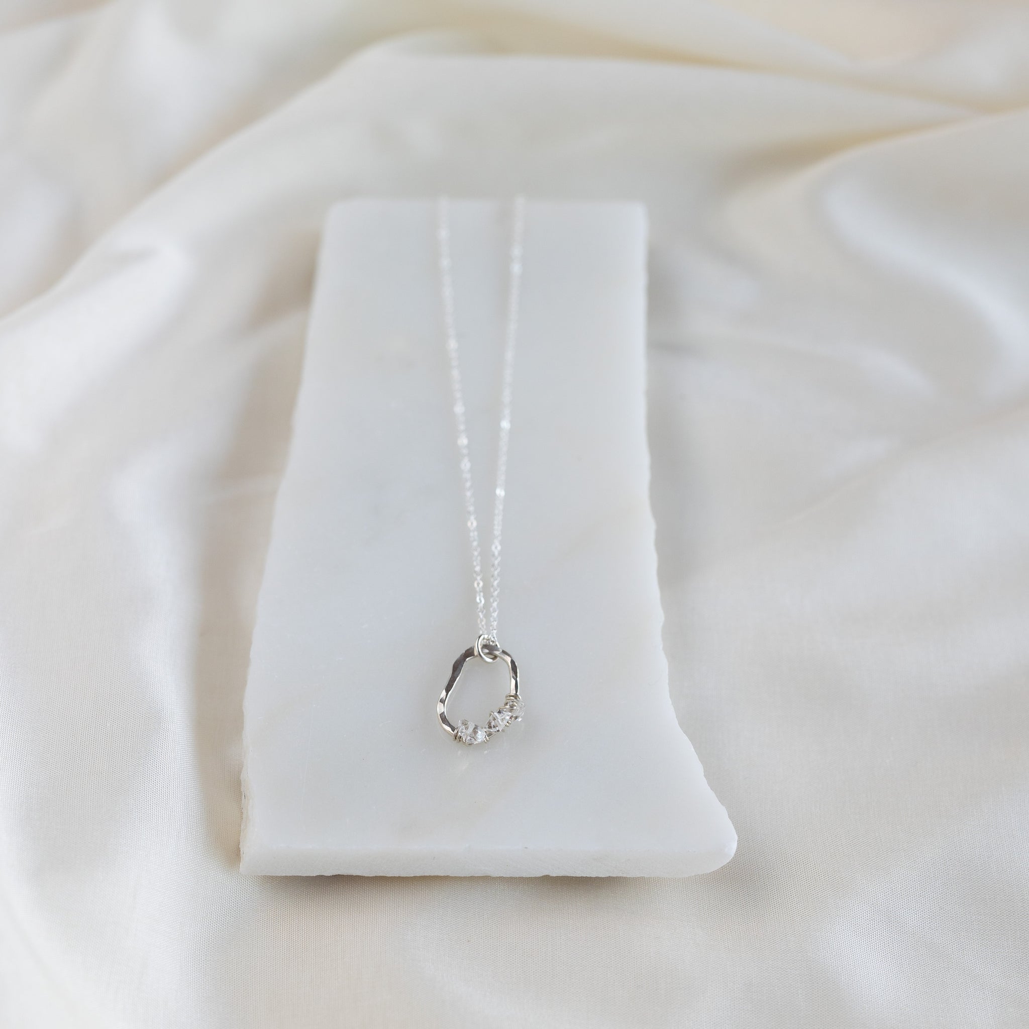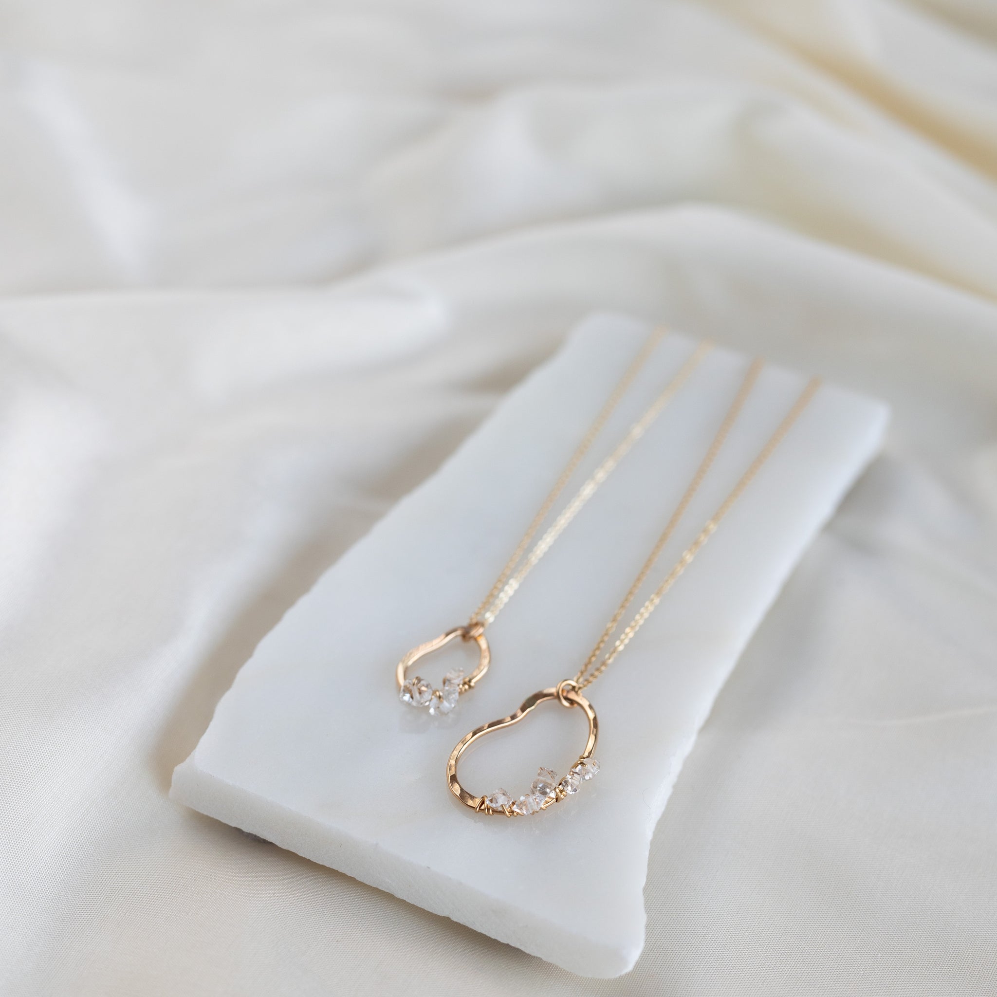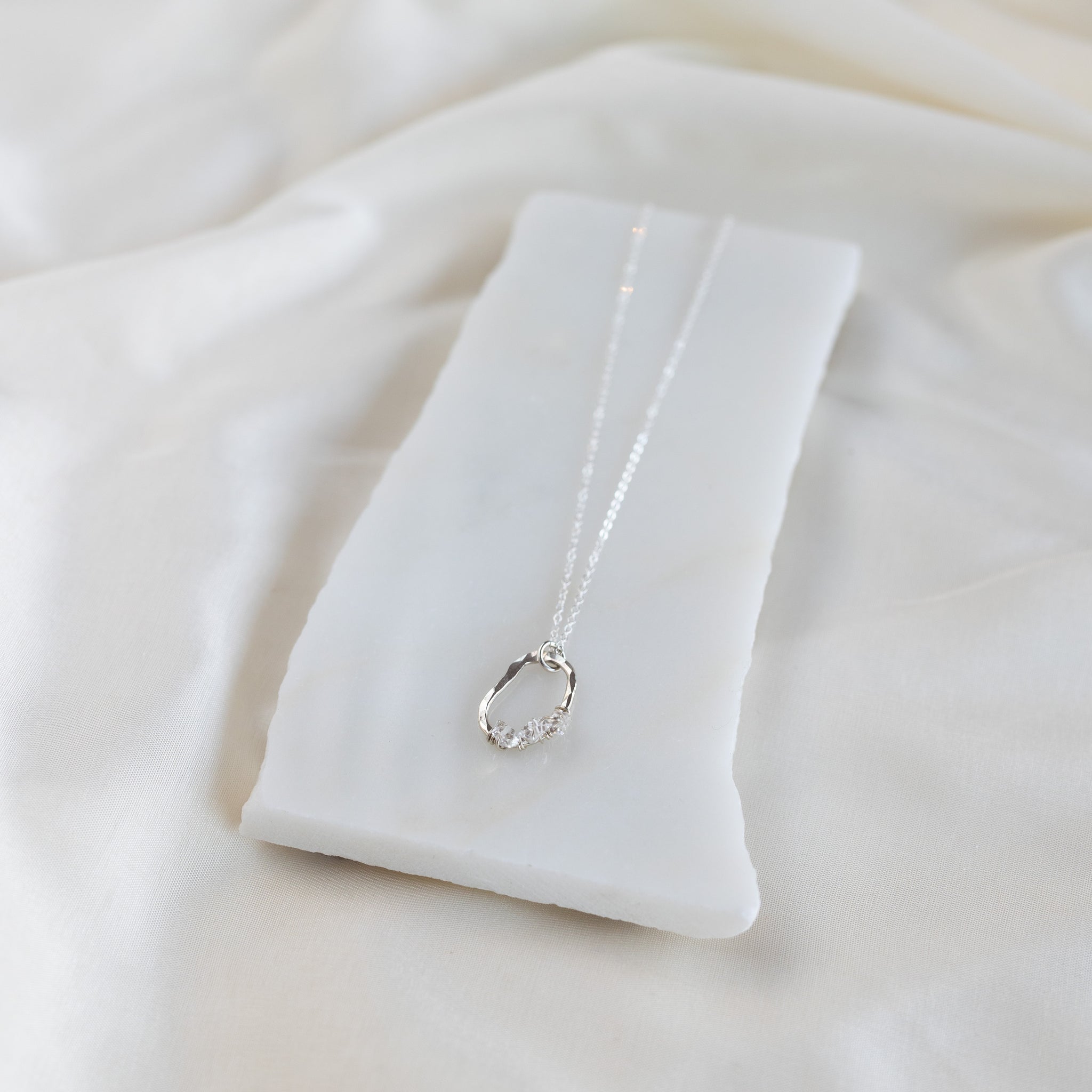 Our vök necklace with herkimer combines soft, fluid form along with clear, icy herkimer diamonds.