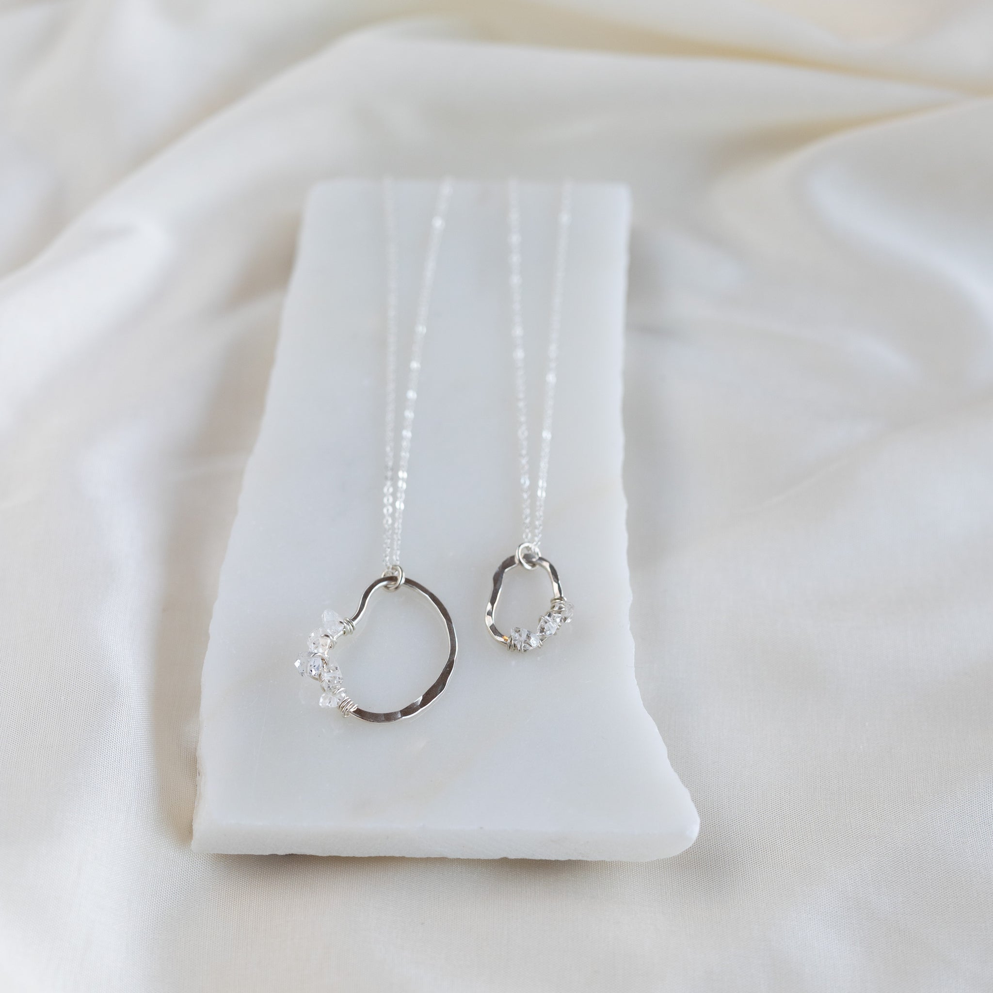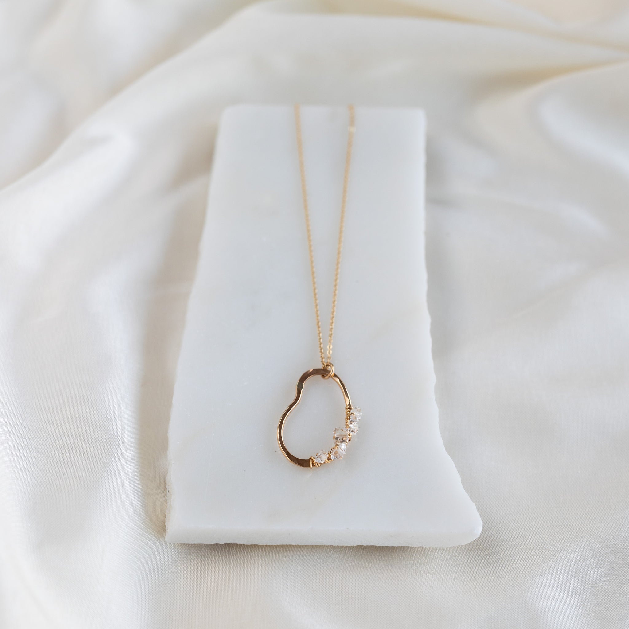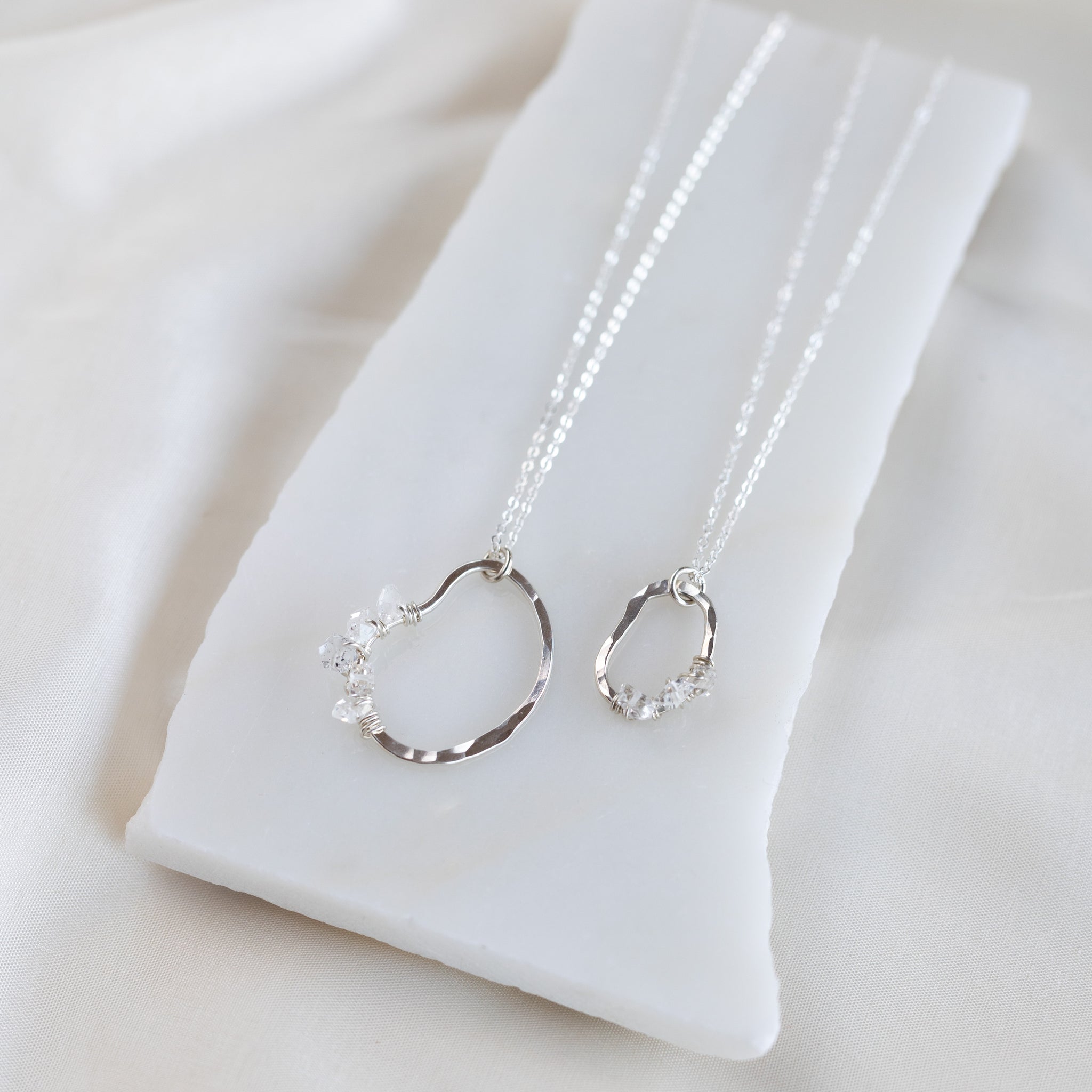 Our vök necklace with herkimer combines soft, fluid form along with clear, icy herkimer diamonds.